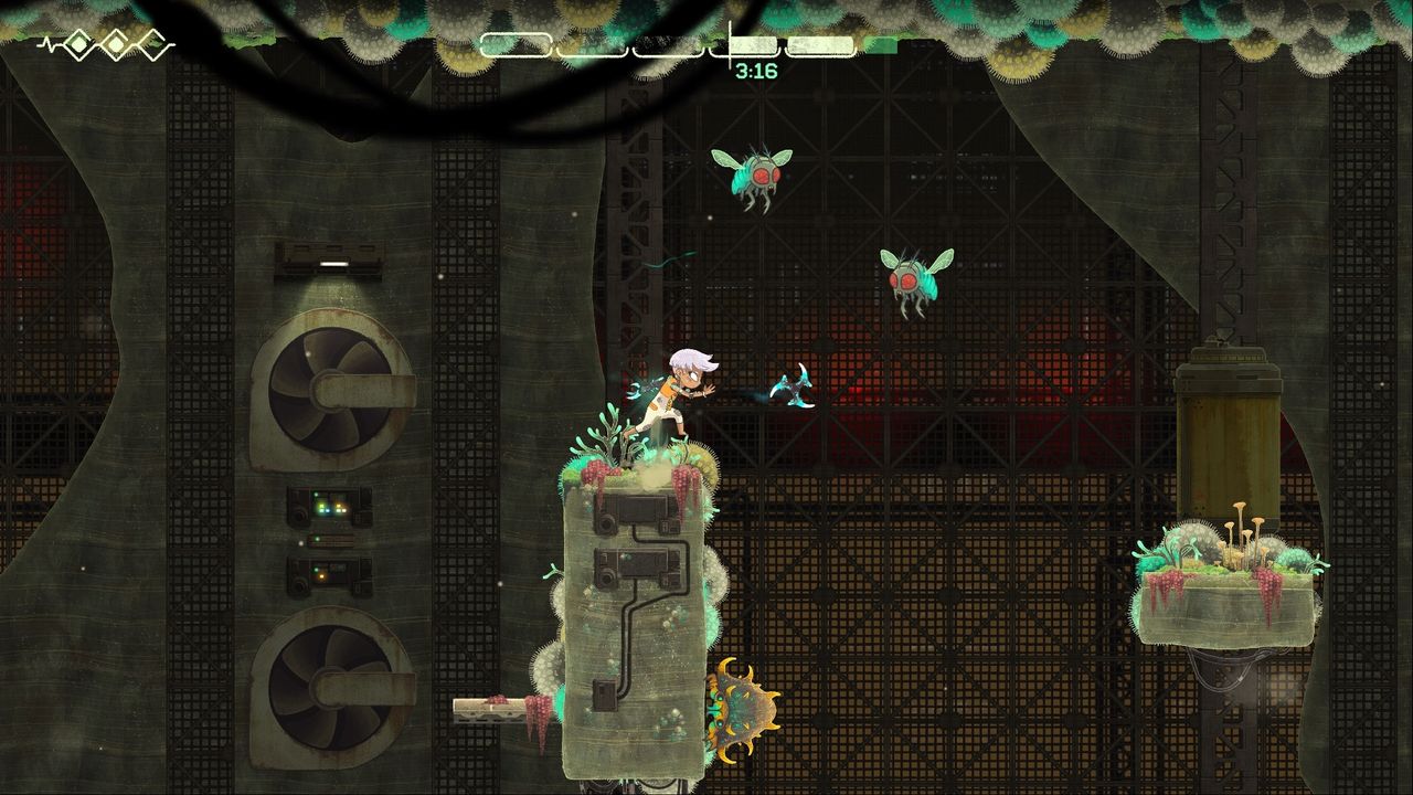 This extends to the discovery of new movement abilities, which is not freeform. Platforming sections don’t require experimentation; by the time I need a new trick, it’s already been explicitly tutorialized. I’m not entirely sold on this approach, but my issues are mostly philosophical. Like, I discovered the double jump before it was taught to me. Presuming I’d been more dogged in my attempts to discover every ability before it was revealed, would I have progressed too far too early? How badly can I sequence break? The fact remains that I didn’t do those things, and the level design gently led me through the appropriate paces. But a player who picks at loose threads will have a different—though probably still engaging—experience.