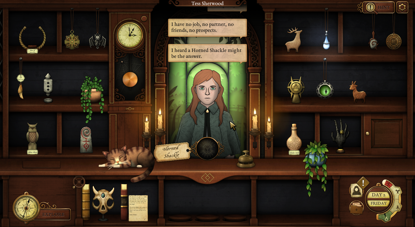 Strange Antiquities has used the foundation of Strange Horticulture. You play as the apprentice and custodian at an antiques store, and must deal with an array of bizarre and sometimes dangerous objects. The local townspeople come to you each day with requests for specific objects for particular functions: for protection, or serenity, or bravery. Sometimes, a customer will ask for an object by name. It is your job to correctly identify the item and hand it over. Getting it right will reward you with new clues or even new antiques; getting it wrong will give you a sense of terrible doom. Too much existential fear means game over, and you'll need to complete a short dice game to start the last puzzle again.