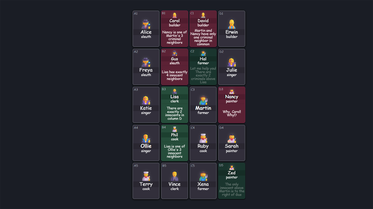 We may have just launched our own daily puzzle game (*cough* Thinky Dailies *cough*), but it was Clues by Sam that carried me through all the busy times of the year. In Clues by Sam, you have a 4x5 grid of characters and have to determine who is innocent and who is a criminal based on clues given to you by those characters. The twist is that you are not allowed to make guesses — you can only ever mark a character as innocent or a criminal when there is enough information to know for certain. This forces you to take a very deductive, or dare I say, very thinky approach to solving them. I’ve fallen off a little recently and need to get back to it, but they’re always fun little puzzles to solve each morning with breakfast. —Joe