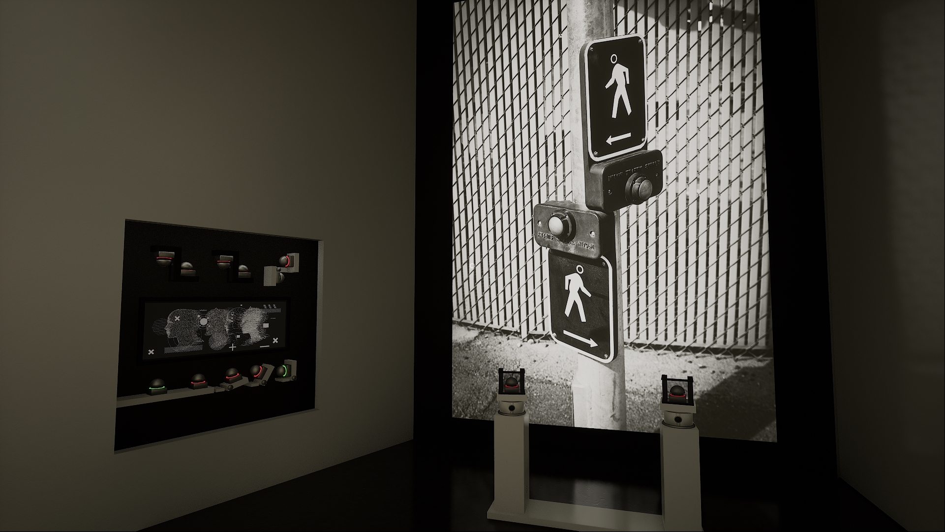 A typical Call of Duty campaign consists of levels as linear as a museum exhibit. The reticle is a visual metaphor for attention. The attention wanders across space (“the environment”) until it finds an enemy soldier (“the object”). To win the game, a player must interact (euphemism) with enough objectives to exhaust the available environment. What Call of Duty conceals with layers of camo and carbon fibre, and what The Button Effect’s exhibit reveals, is the nature of this interaction. A button is pressed. The world responds.