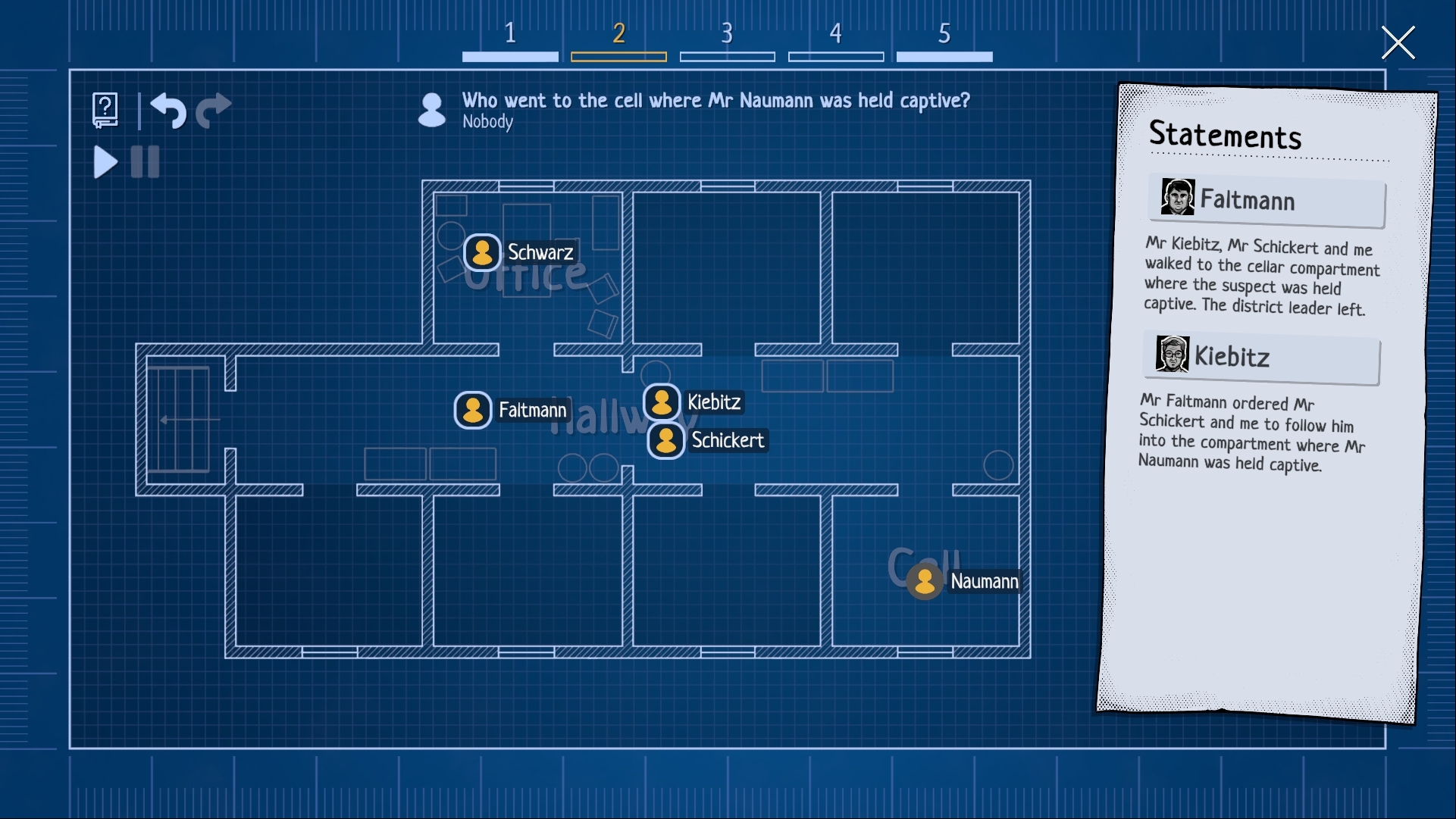 In The Darkest Files, policework can’t be trusted. Unreliable bureaucracy is exactly the problem you’re trying to solve. Beneath the NSDAP’s official-sounding verbiage and curt dismissals is an engine of petulance, human cruelty disguised as justice. Testimonies are often far more illuminating. When Katz brings a witness in for questioning, the scene dissolves into a memory in which she can walk and interact. The player literally inhabits the witness’s version of events, details of the scene subtly shifting based on who’s telling the story and what they’re trying to get you to believe. Not every contradiction means something: memory is flawed, and even outright lies are rarely organized. People lie to cover for someone, or to make themselves look good, or because they are too afraid to acknowledge the truth.