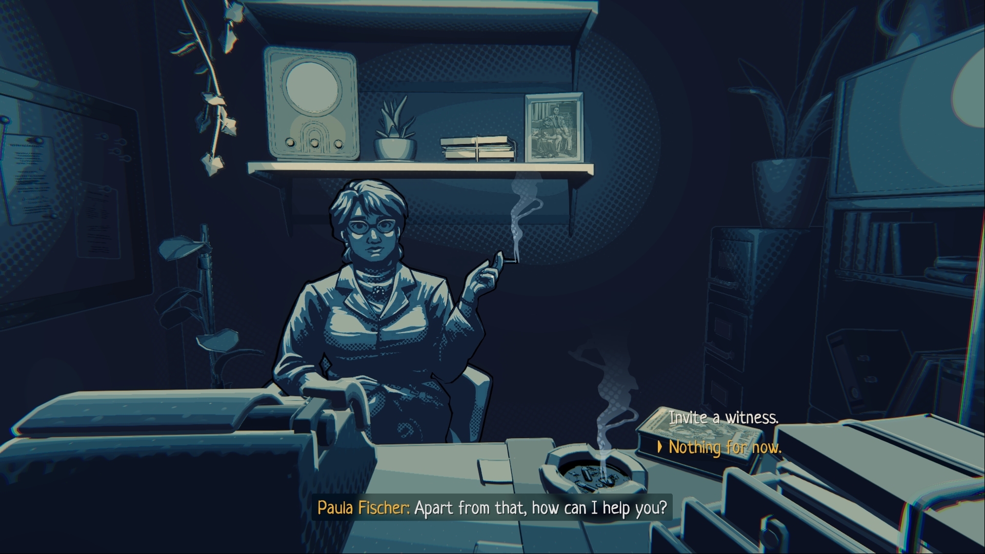 The Darkest Files is, at times, held back by convention. Its characters are legal drama characters, and it engages in a bit of hero worship with regard to Fritz Bauer, diluting his real greatness by neglecting to distinguish between history and hyperbole. The verification system, which states objectively when a correct conclusion has been reached (compulsory for any detective title this side of Pentiment), glares a bit when juxtaposed to the rest of the game’s commitment to subjectivity. Most of its sacrifices seem directed towards making the game function as a playable game rather than an edutainment product.