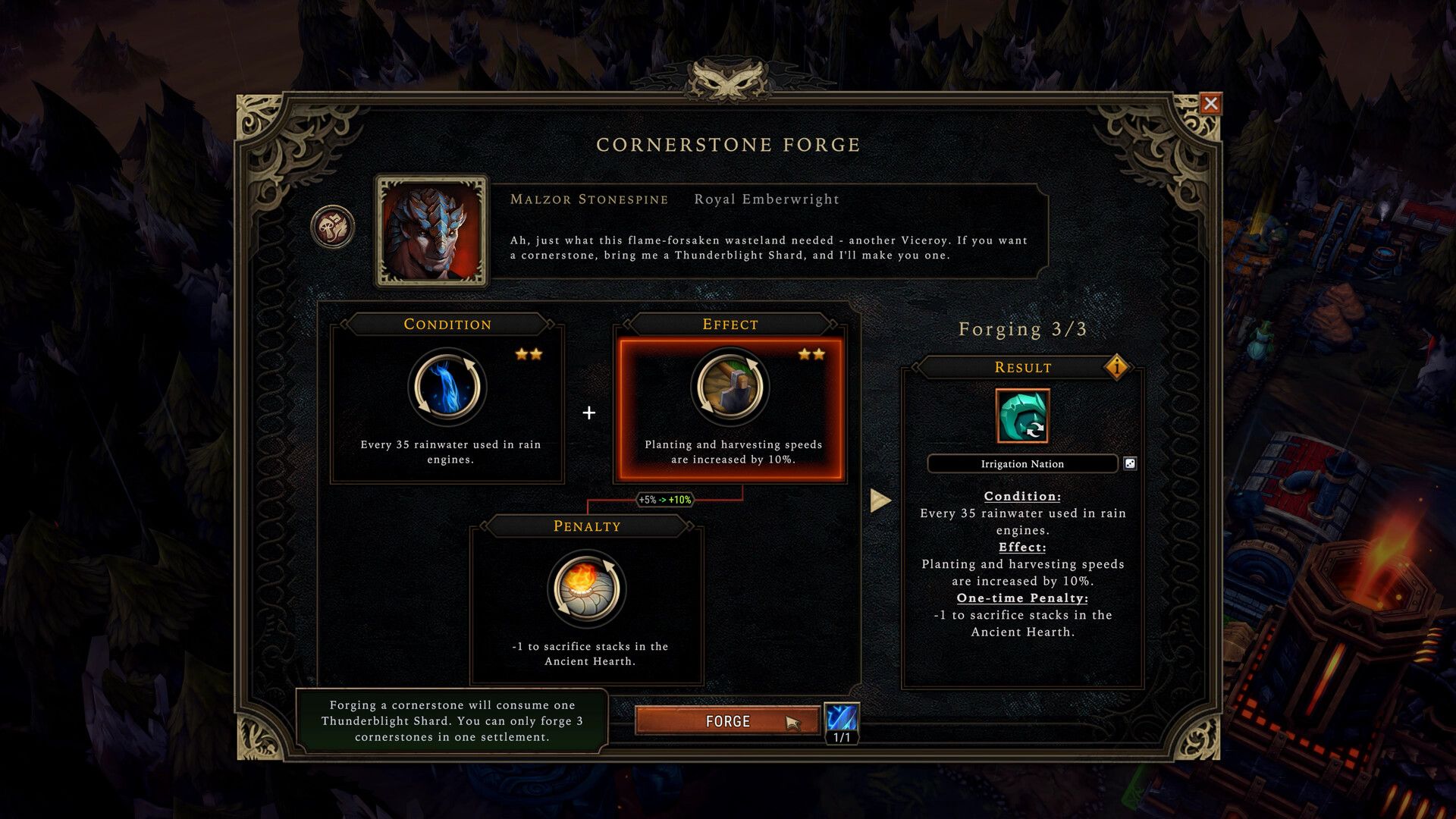 Brave the new Ashen Thicket biome, ravaged by industrial exploitation and the Blightstorm alike. The barren lands here are home to the rare Thunderblight Shards – lightning-infused crystals that can be mined at great cost, crucial for forging Cornerstones using the Ashen Thicket’s unique Cornerstone Forge building. With only a limited number of opportunities to produce your own Cornerstones, you must strategically choose which conditions and rewards go hand-in-hand, with the option to take on penalties in the hopes of bolstering their benefit.