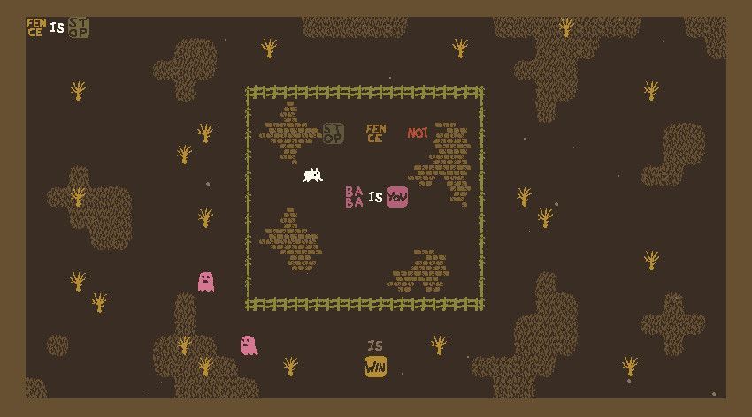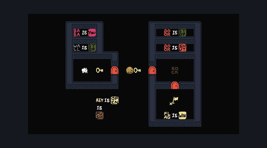 In each level of Baba is You, the rules that dictate how the level works are written out in-level as simple sentences. The words that form these sentences are blocks that can be pushed and rearranged within the level grid, affecting the currently active set of rules. For example, if the level has the rule “WALL IS STOP,” walls are impassable. However, if you replace the word “STOP” with the word “PUSH”, those walls can now be broken apart and pushed around like boxes. Many levels are designed around subverting your expectations of what can and cannot be done, requiring both logical reasoning and lateral thinking to tackle them.