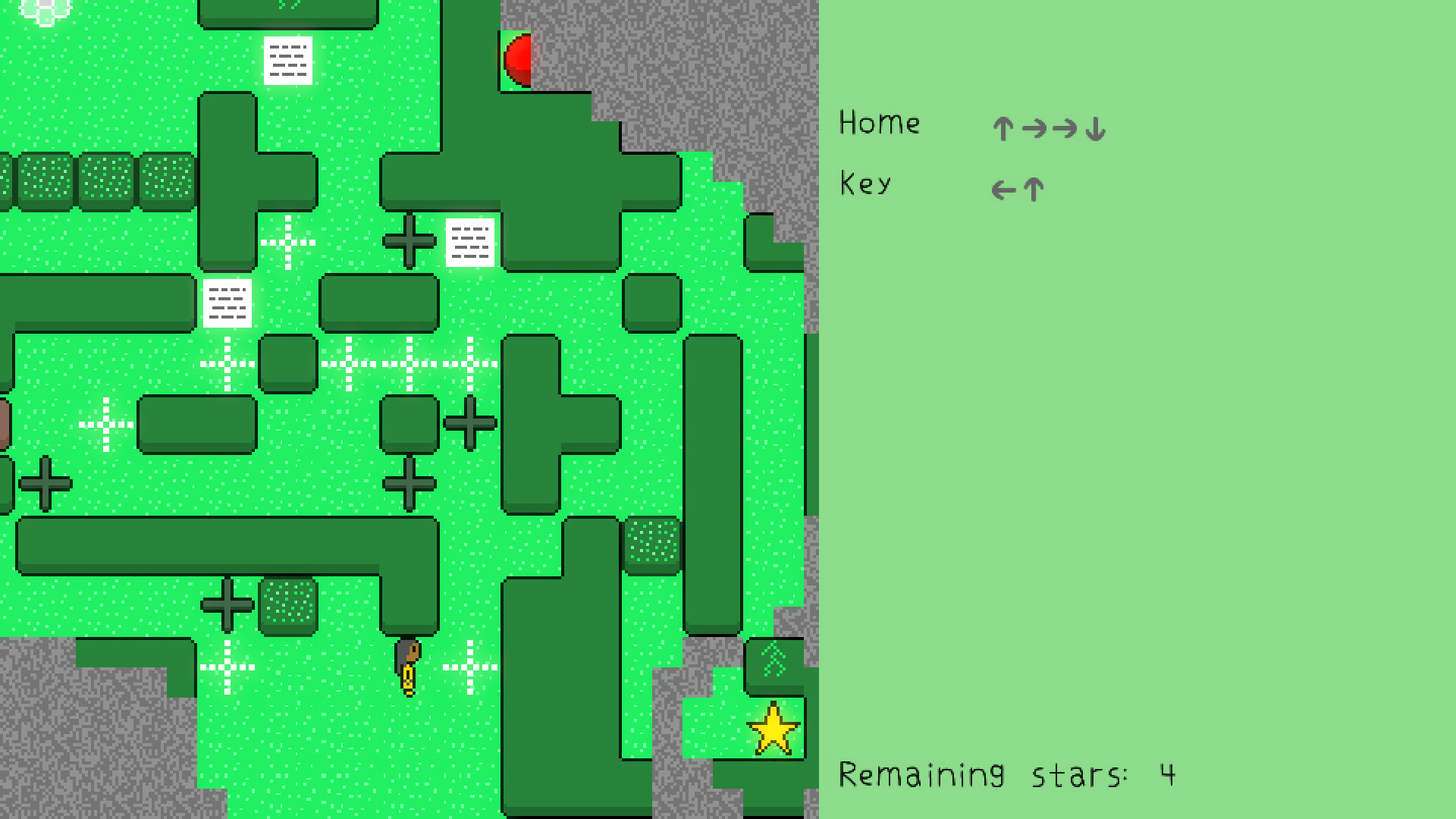 Starting out, a layer of fog surrounds most of the map, hiding elements until you get close enough to them. The level contains several orbs which, once picked up, will teach you the steps to perform spells and unlock their casting. Each short series of instructions comes in the form of arrows and dots. You’ll have to figure out what each spell does and how it could help you get closer to the stars. A few tips and humorous drawings can be found on scattered pieces of paper.