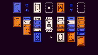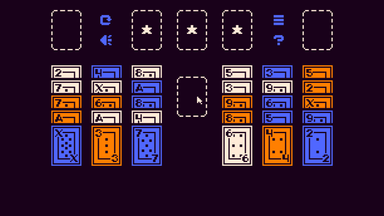 This unusual form of solitaire has only 3 suits, so your goal is to create an ordered stack for each suit from Ace to 10 (10 is represented by an "X"). There are two tableaus where you can rearrange your available cards, moving cards to any other part of the tableau as long as they're placed on top of a card of a different suit and are valued either 1 higher or 1 lower than that card.