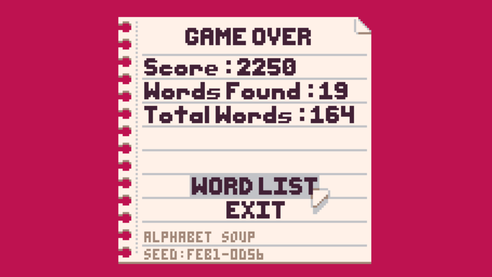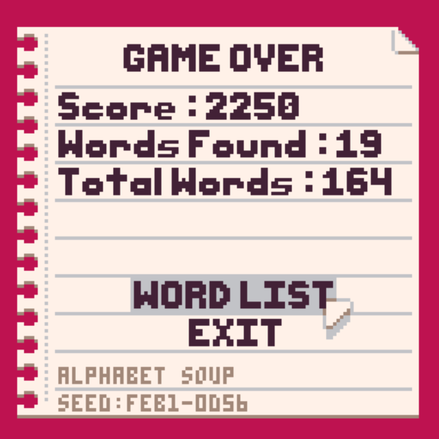- Alphabet Soup - main mode, 4x4 grid and 2 minutes, pick only adjacent letters
