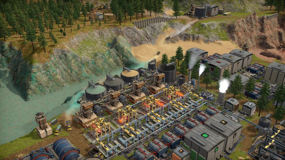 Excavate the earth and control an armada of vehicles to create a mega-factory on an abandoned island.
