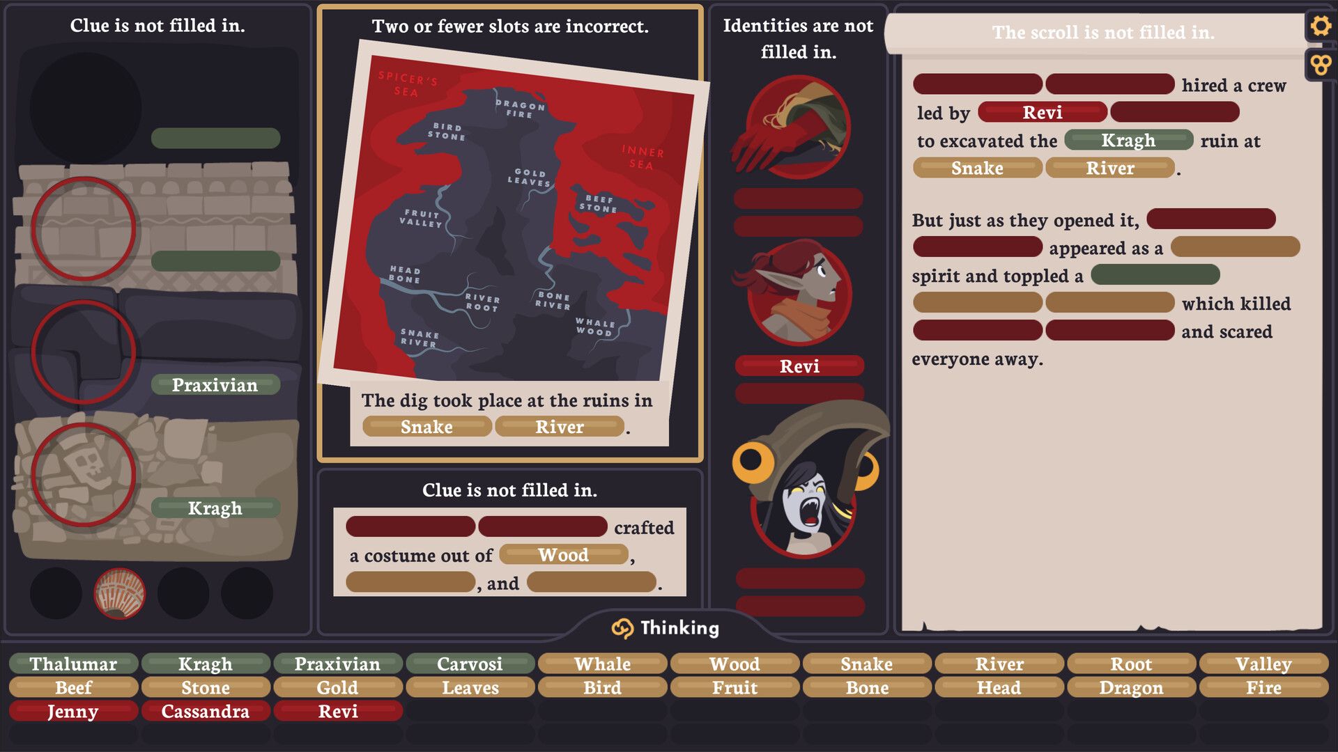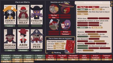 When you have gathered all the pieces of the puzzle, switch to the thinking screen. Use clues and keywords to name the killer, method, motive, and location.