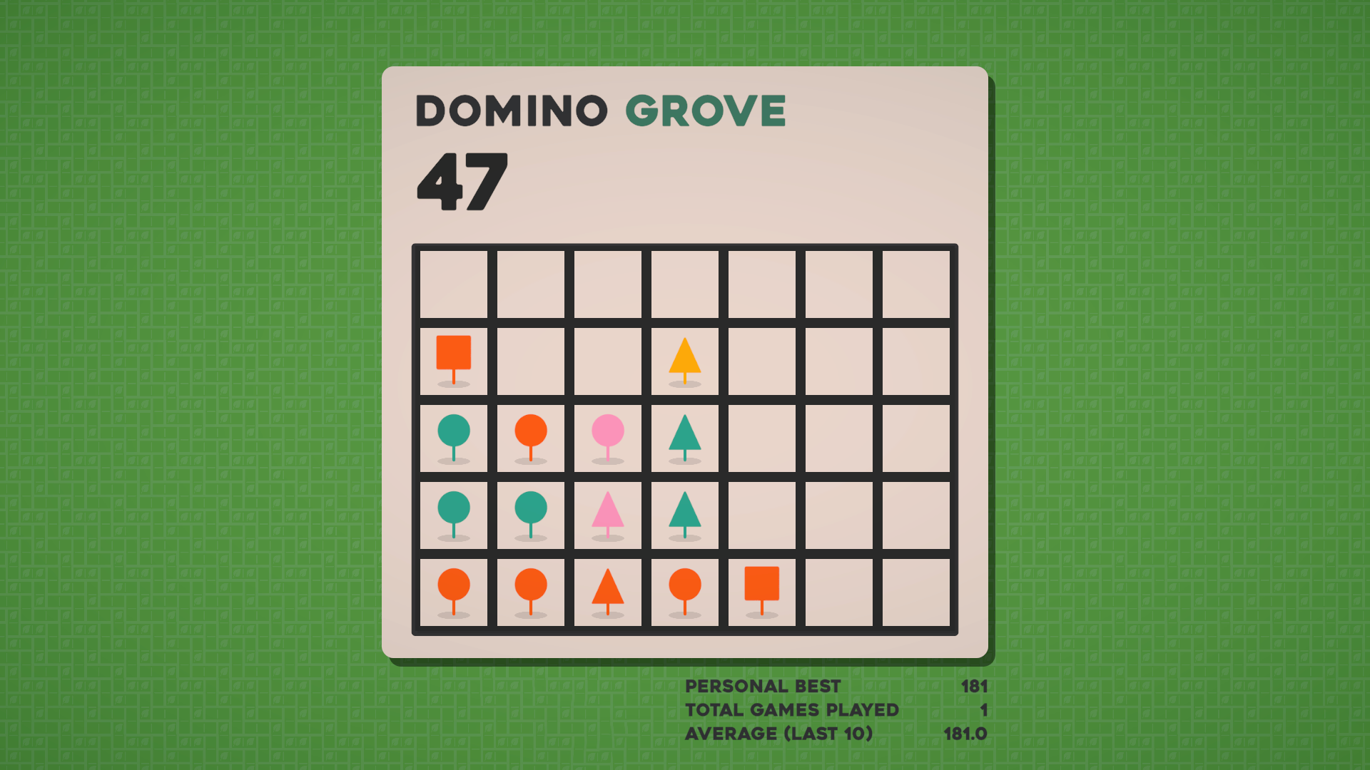 Domino Grove is a very simple, tactile game that you can learn and play very quickly, but with lots of room to improve your tree-planting strategies.