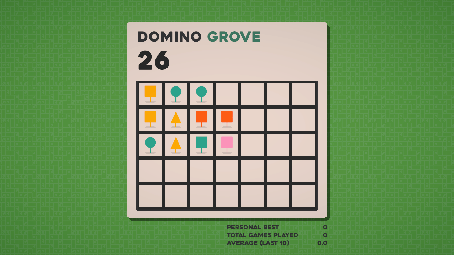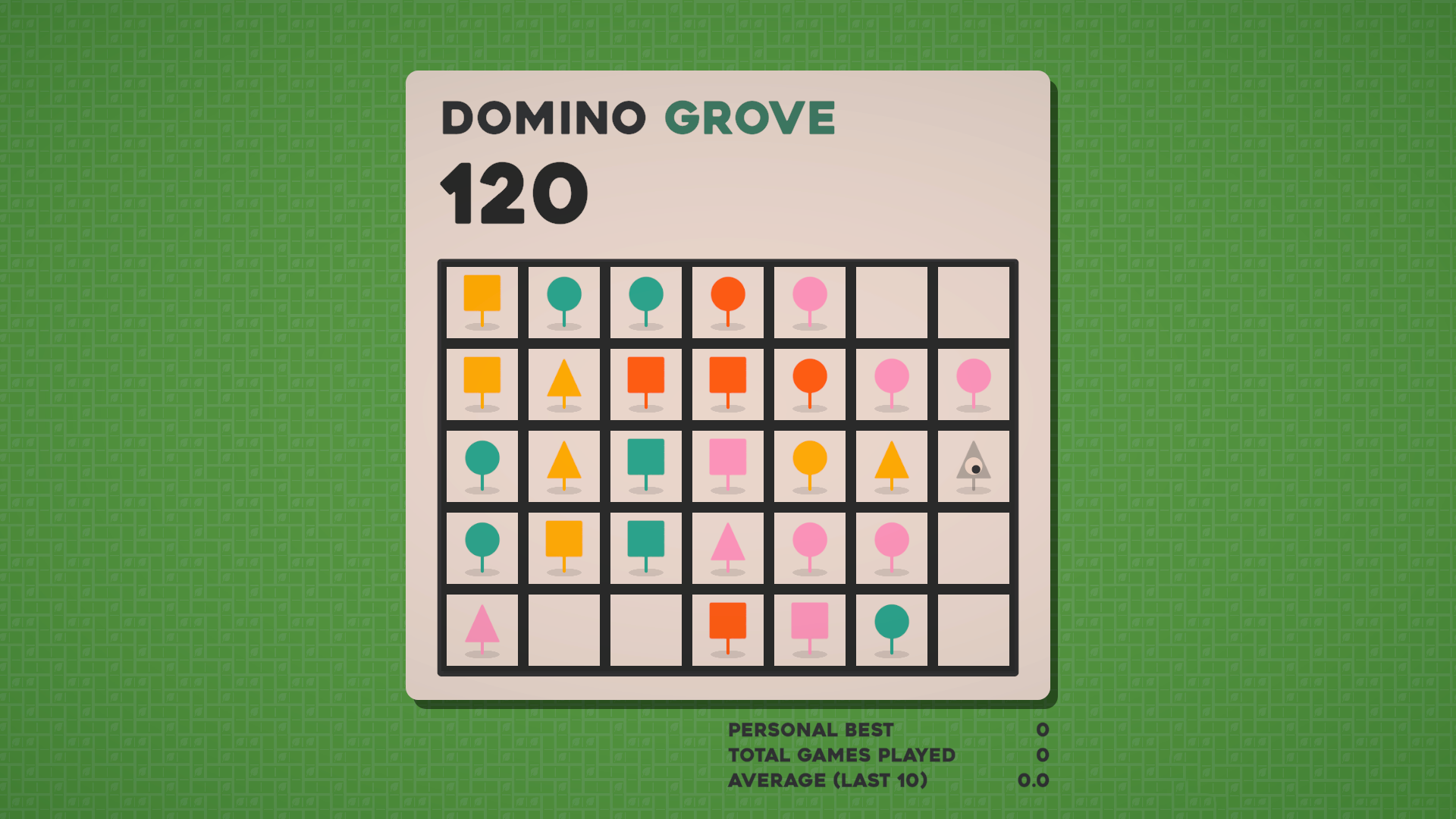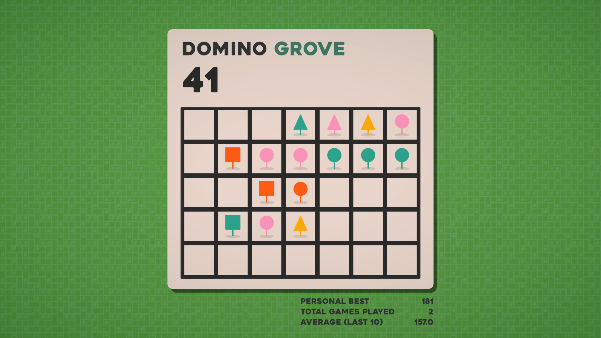 Each run of Domino Grove takes place on a 7x5 grid, on which you must place a series of randomly selected domino tiles. Each domino has two trees on it, which have a specific shape and color, and will score points according to nearby trees when placed. In particular, each region of same-shape or same-color trees that the domino is part of will score points equal to its size.