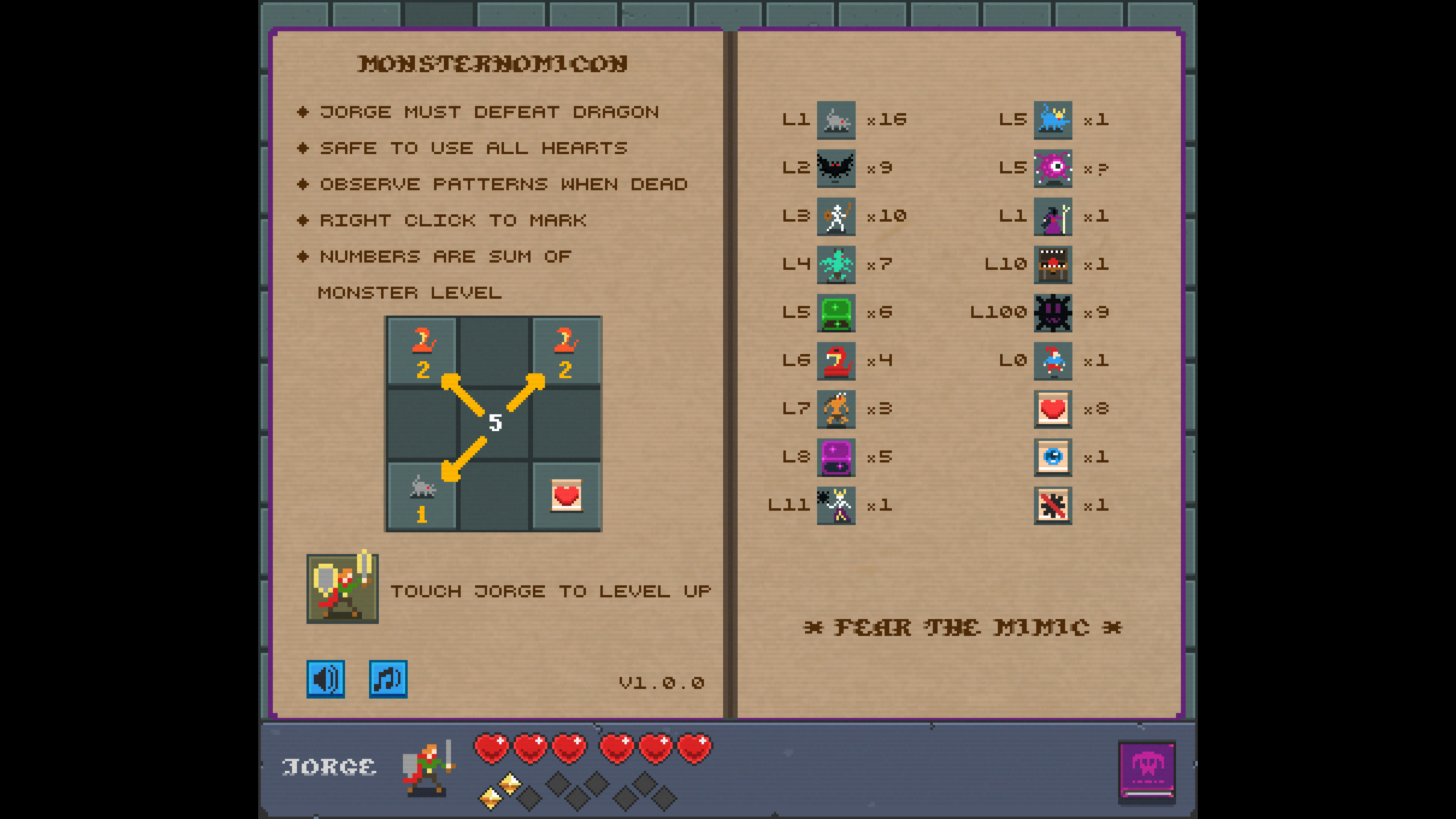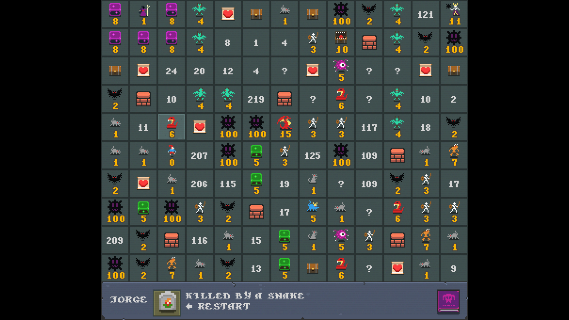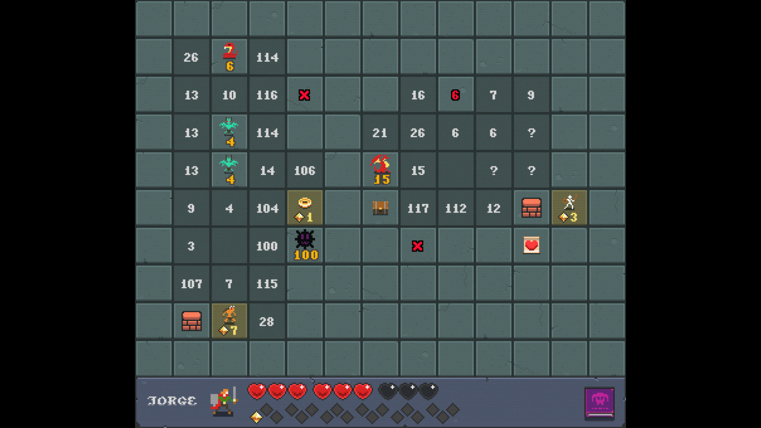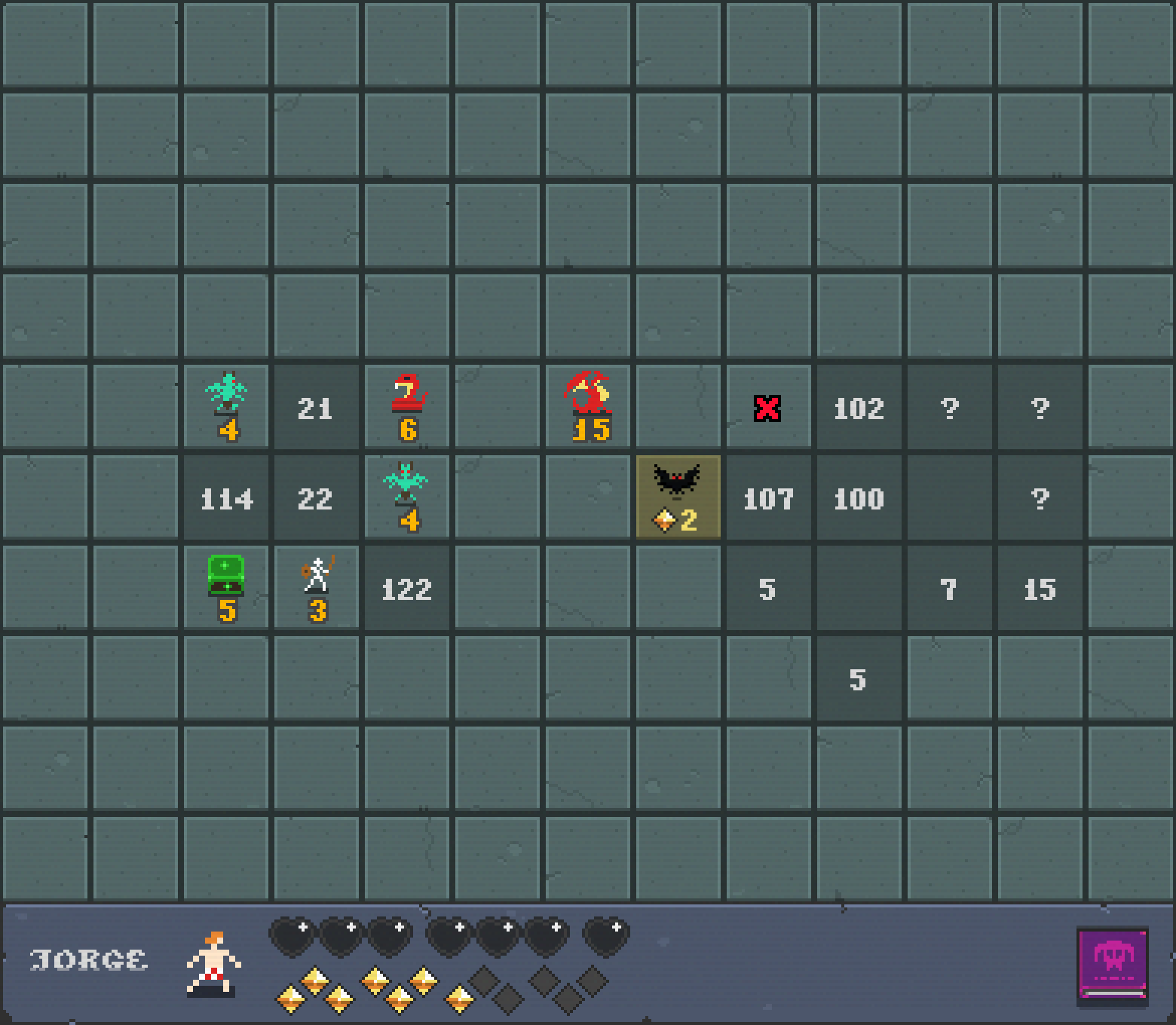 The level of each monster determines how much damage your character, the brave dragon slayer Jorge, will take when that monster is revealed. Jorge begins with 5 hearts, but can level up by collecting gold acquired from defeated monsters and hidden chests. Therefore, to defeat the level 15 dragon and complete the game, Jorge must reach 15 hearts in total. To reach that goal, you must carefully decide which monsters to defeat, narrowly avoiding death while gaining enough information about nearby tiles to explore further. However, death is not all bad, as it reveals the entire dungeon layout, from which you may be able to identify some common patterns.