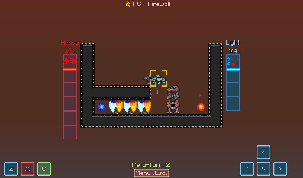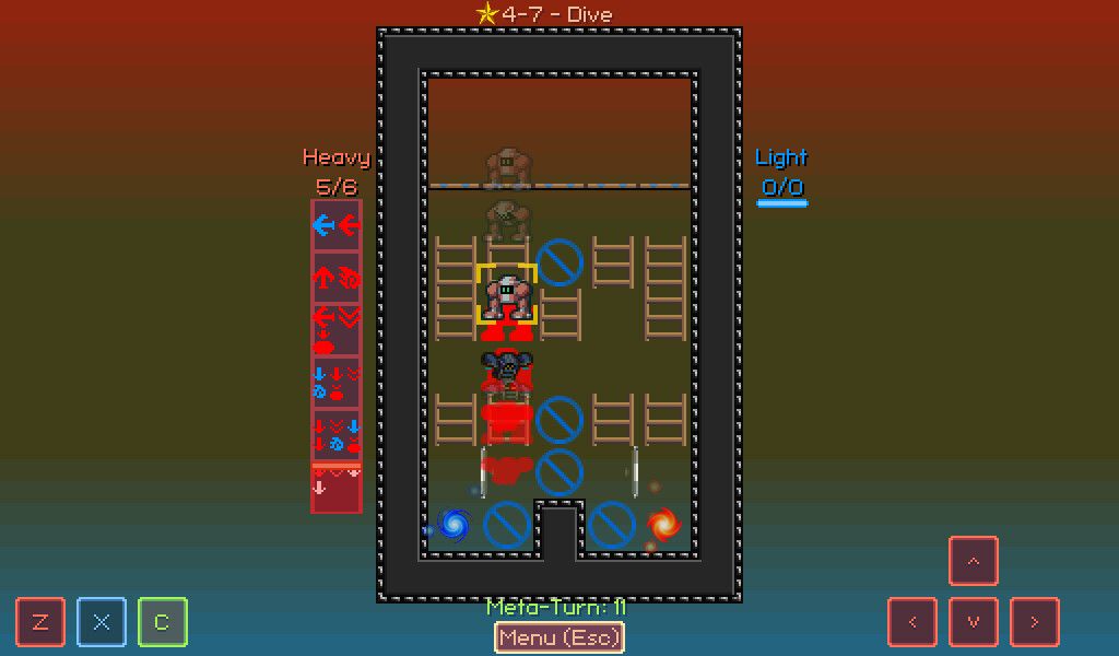 The goal of each puzzle is to help the two robots reach their corresponding portal — red for Heavy, blue for Light — by inputting a series of movements. Each robot has its own timeline with limited slots, into which you can provide the movements for that robot — left, right, down to rest or fall, and up to jump. However, these two timelines act as their own independent undo stack, meaning you can rewind one robot through time while leaving the other robot where it is. Using these time-manipulation tricks, you'll need to help the robots clamber over walls and each other to reach their destination.