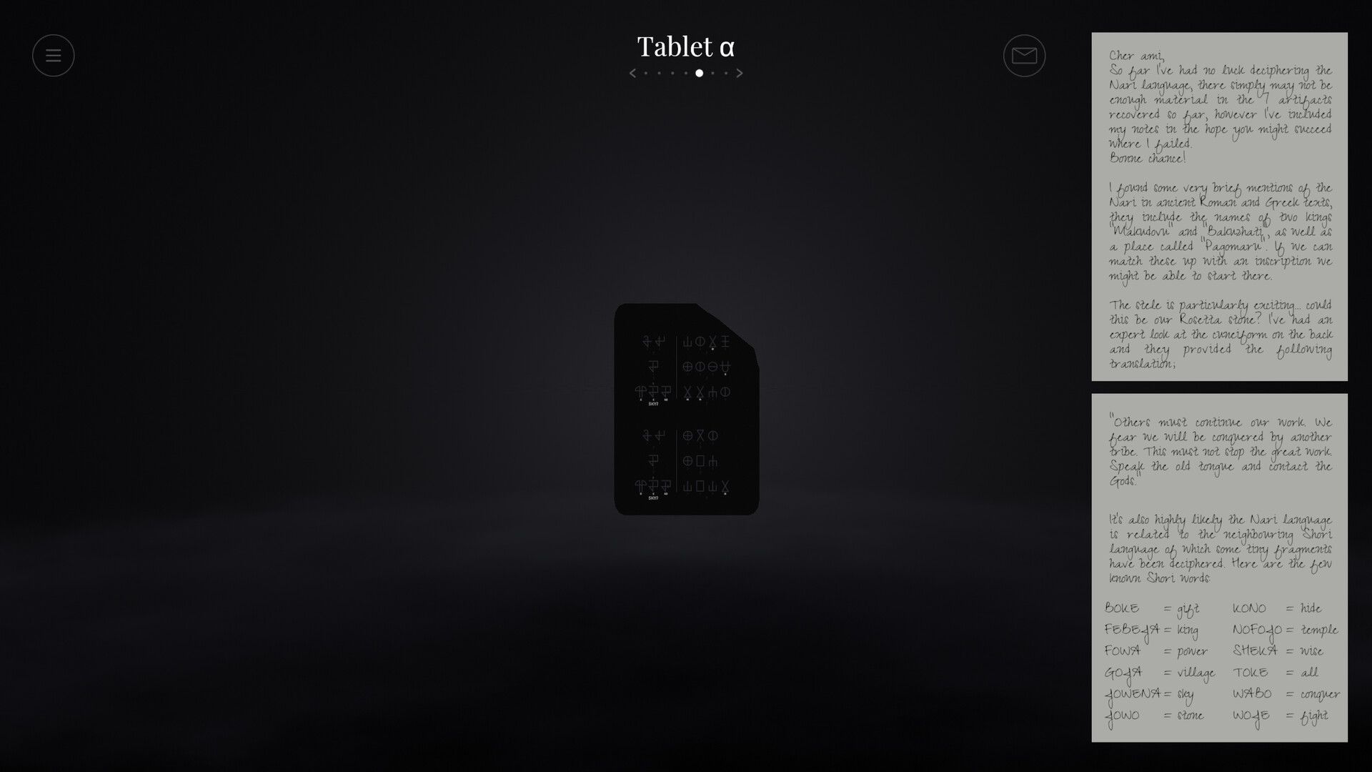 If you make a discovery or feel like experimenting, you can fill in individual symbols or whole words. When you do this, the matching symbols or words across all artifacts will automatically fill themselves in. To decipher the Nari language, you may need to take your own notes along the way. Playing the part of a linguist, you’ll need to reconsider rules of your own language that feel intuitive: from sentence structure to how many sounds a single symbol denotes. Studying the text thoroughly is the only way to find patterns and eventually discover the rules of the Nari language.