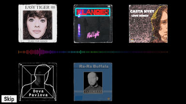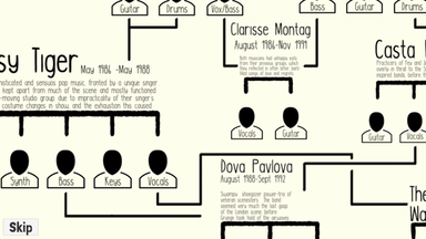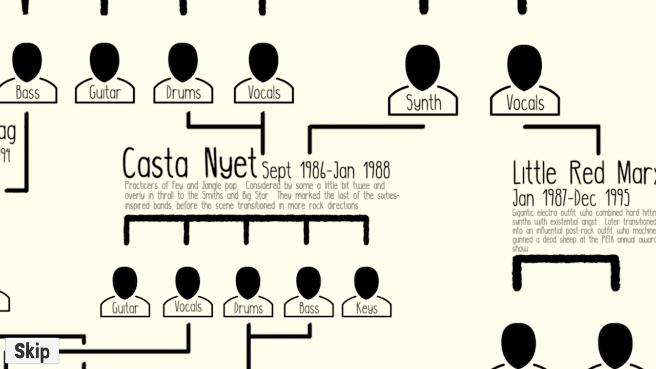 Shift through interview snippets and music tracks to identify band members from a fictional indie scene.