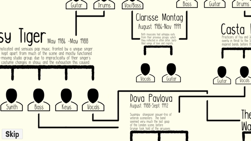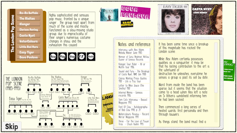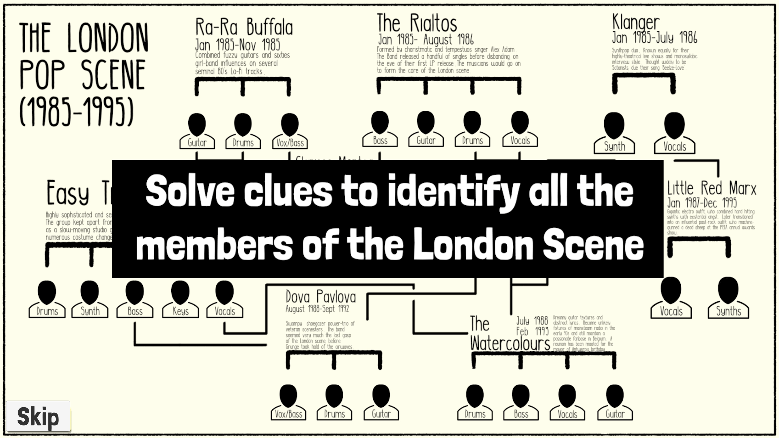 Shift through interview snippets and music tracks to identify band members from a fictional indie scene.