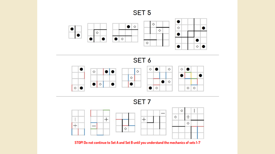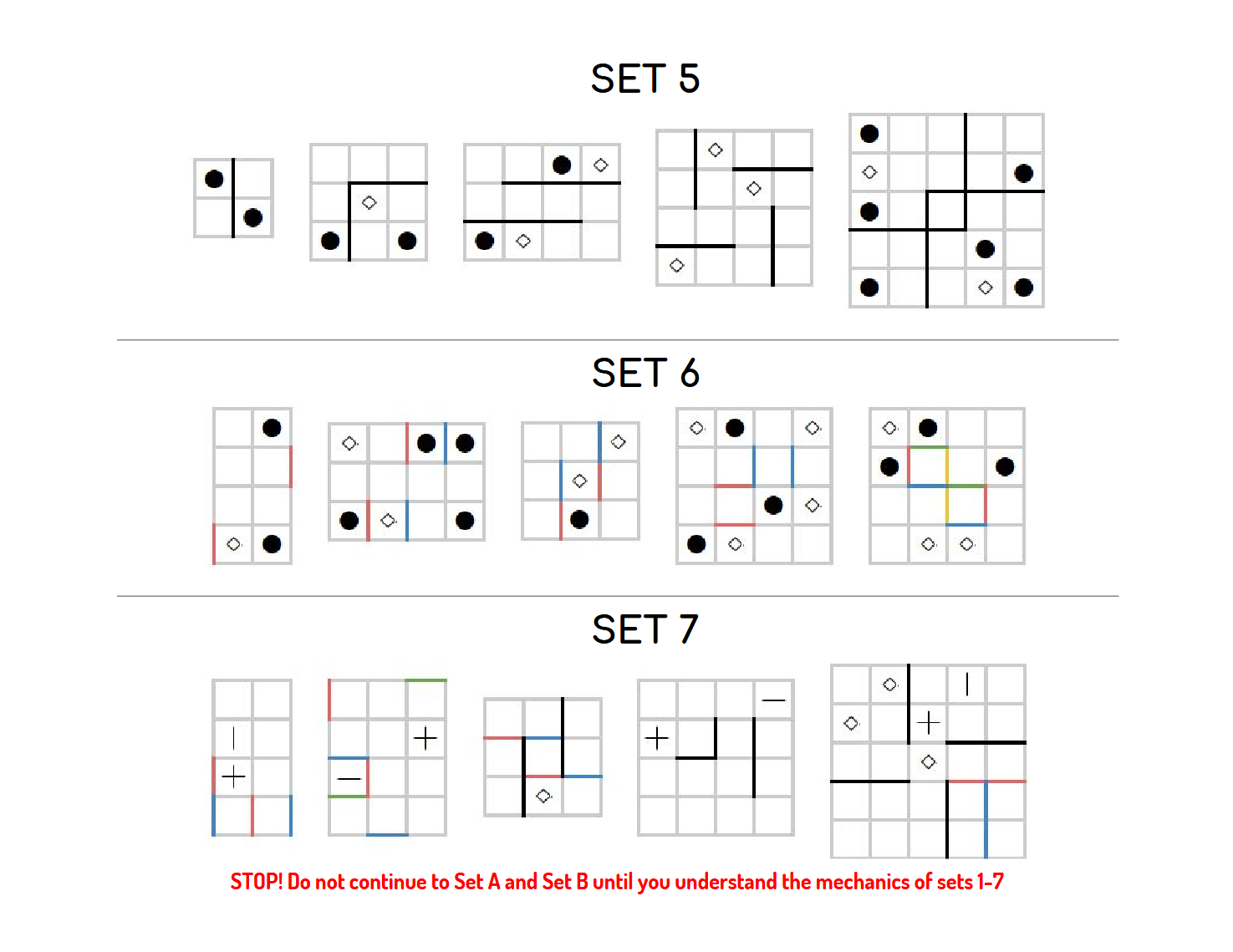 Your goal is to infer the rules and solve the puzzles. If you have done so correctly, each of the grids will have a unique solution. It will help you to use this fact to help you figure out the rules. If you form a guess about the rules that does not lead to a unique solution, then your guess is not correct.