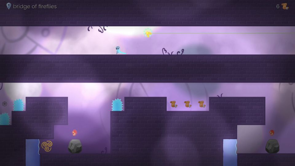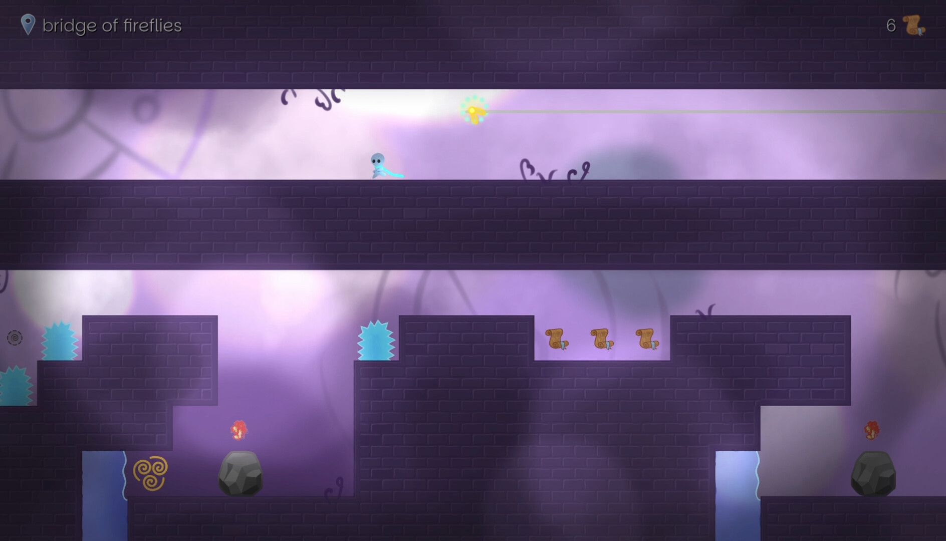 Your main goals in Glowkeeper are to explore the world and attain collectible scrolls that open locked gates. You control a simple platformer character who can run and jump around. However, obstacles and hazards like dirt and ice tend to block your way. Luckily, you have an extra ability: your cursor controls a firefly that can connect adjacent elements of the same type. Whenever three or more elements are connected they vanish, while everything sitting atop them falls into new positions.