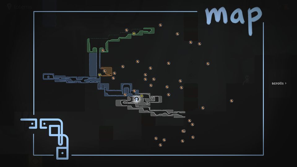 Glowkeeper takes place in a single continuous world, where there are almost always multiple different puzzles to tackle at once. The game’s simple fast travel system minimizes pointless backtracking, and its built-in hint system can help guide you to the solution for a particularly tricky puzzle. The game even has a way to slow down time to make platforming easier, as platforming isn’t intended to be the source of the game’s challenge.