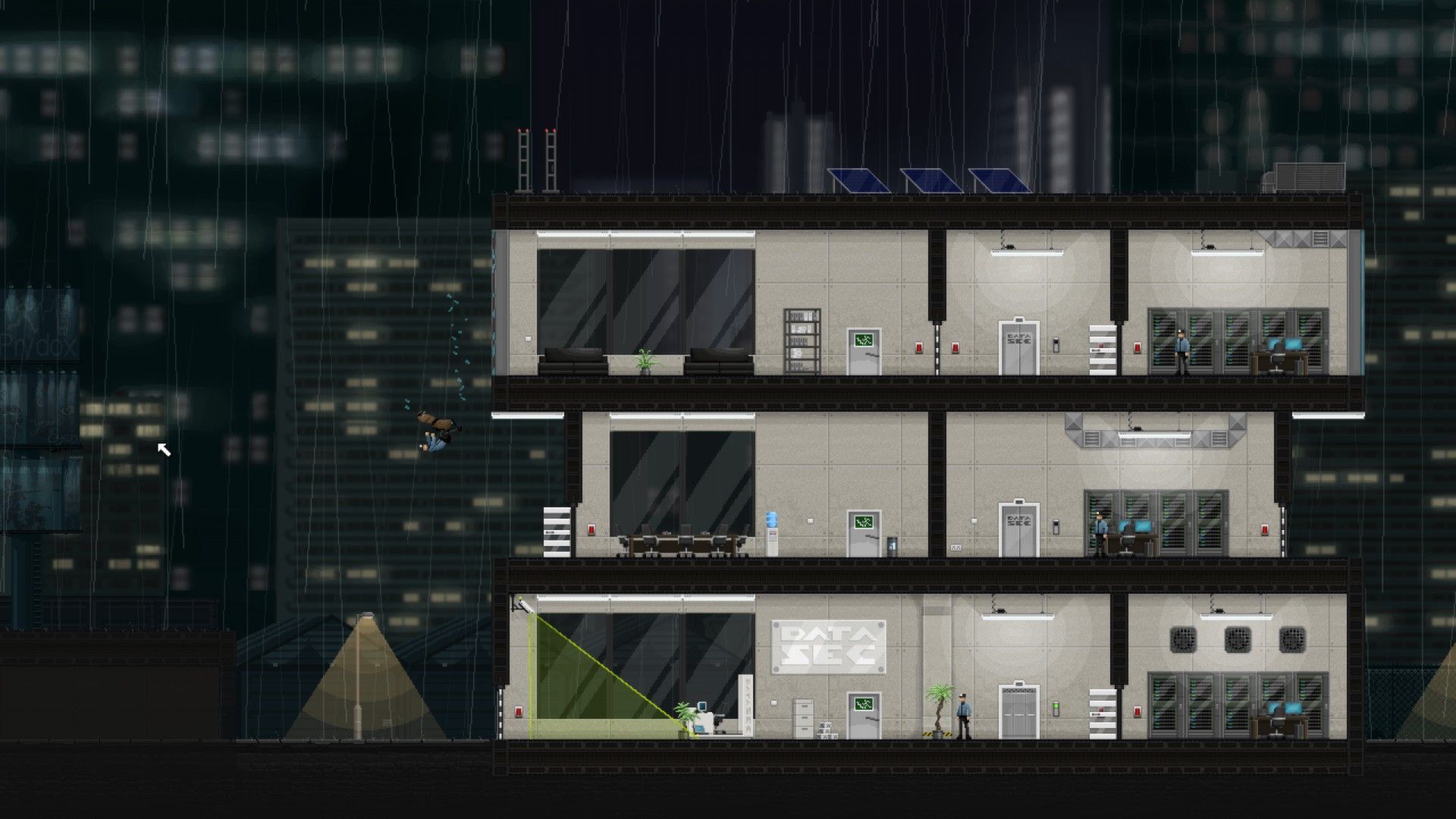 To get past security, you'll need to make creative use of your main gadget: the Crosslink. It lets you see how all the security devices in a level are wired up, and then you can just click and drag with the mouse to wire them differently. So you can connect a lightswitch to a trapdoor, then flick it when a guard walks across to make him fall through.