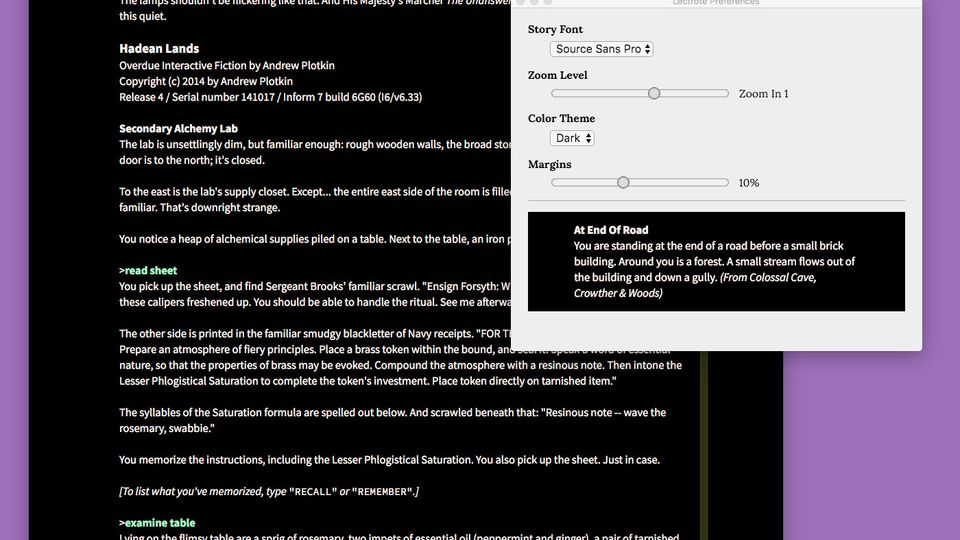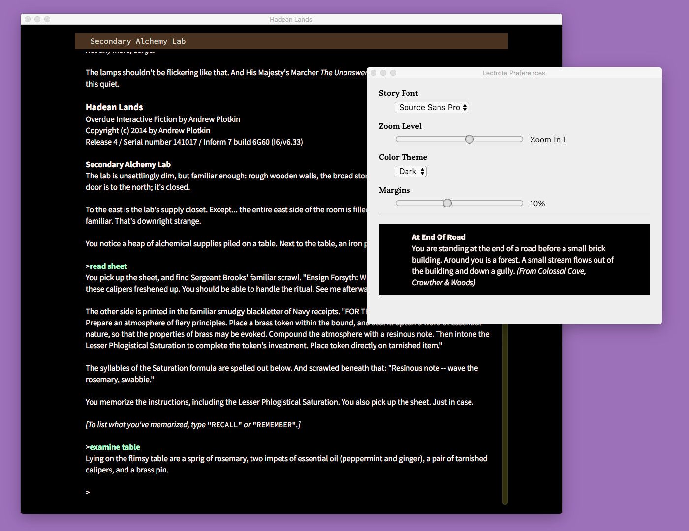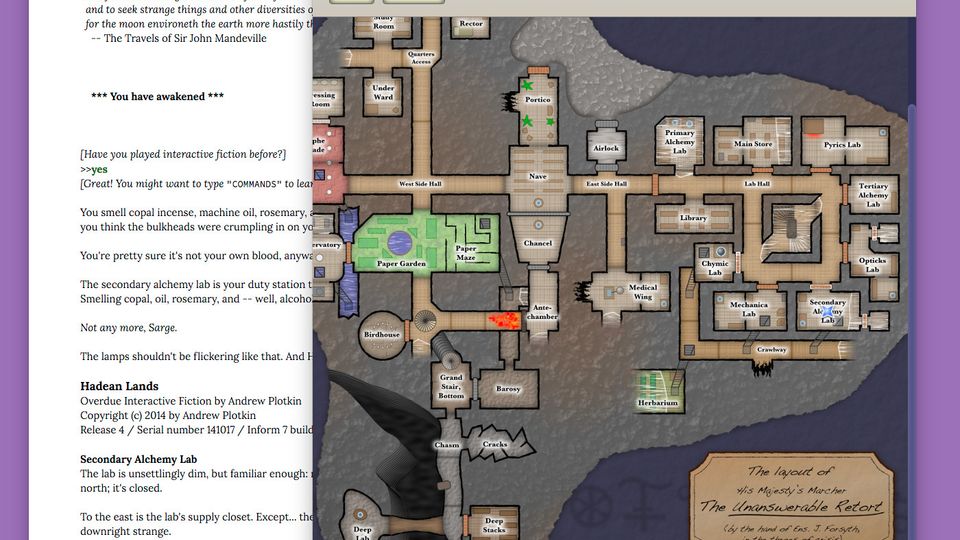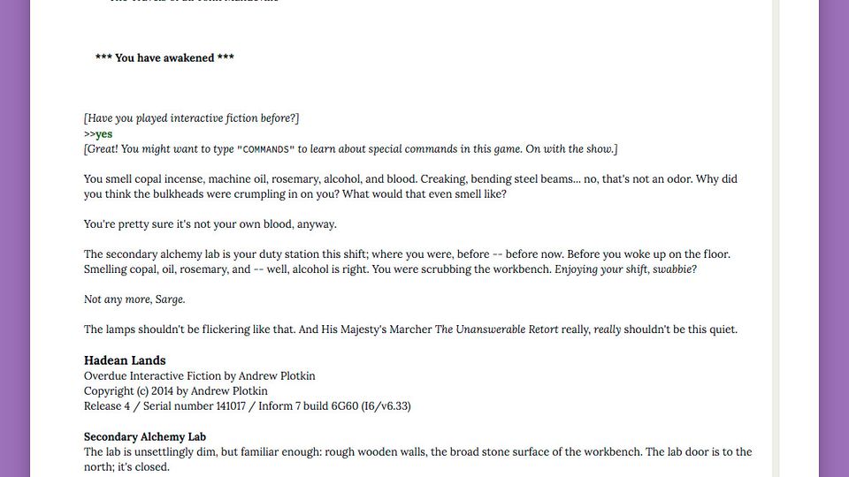 Hadean Lands is interactive fiction — a classic text adventure. No graphics! No dialogue trees! No point-and-click! You type your commands, and read what happens next.