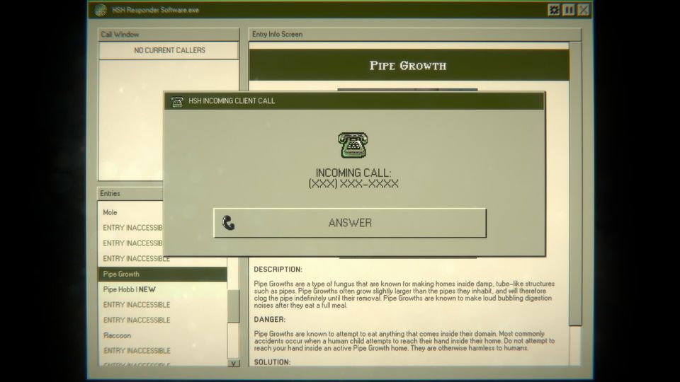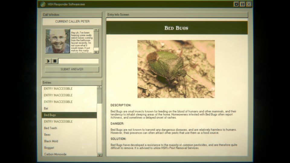 Home Safety Hotline is an analog horror inspired telephone operator simulator where you answer incoming callers' questions about what's inside their home. Read through a vast catalog of common pests and household hazards, and do your best to become an expert in home safety. You will be held responsible for what happens.