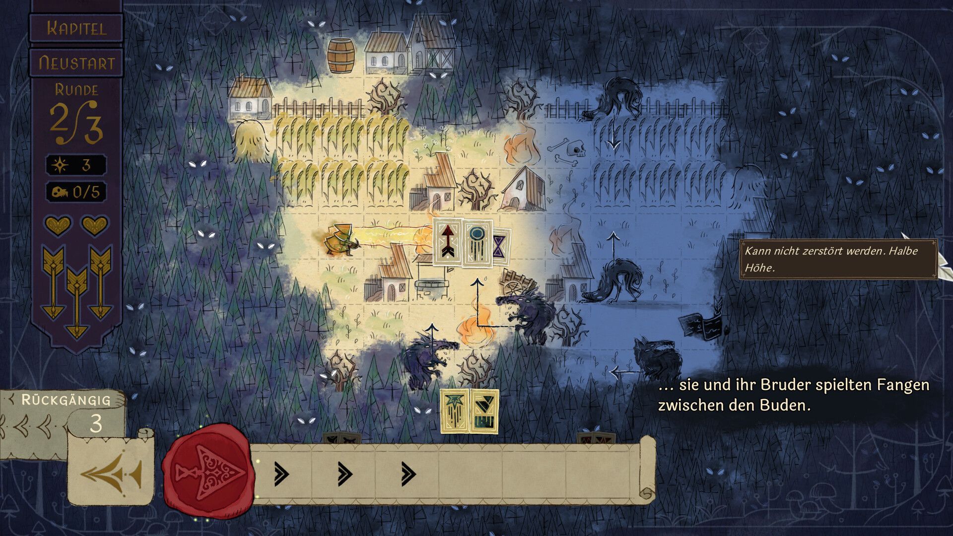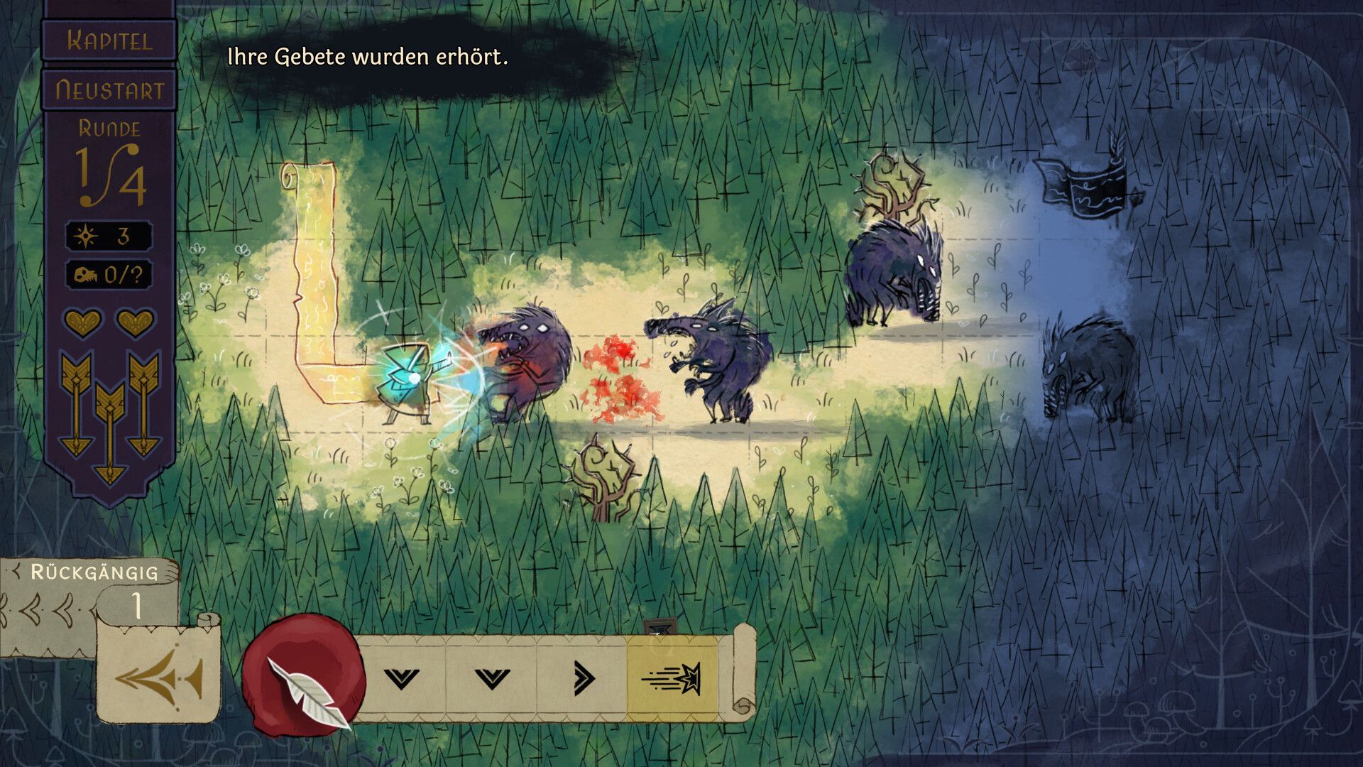 Not only do you have your wits to rely on while plotting your attack, you also have an array of abilities at your disposal. As you slay more wolves, you acquire skills like Vault, Smoke Bomb, and Piercing Shot. Venture forth on your journey to upgrade your skills and unlock more Action Slots and Undo Round Points. As you plan your moves, you will also shape your own prophecy, composing a dynamic work of scripture as you fight.