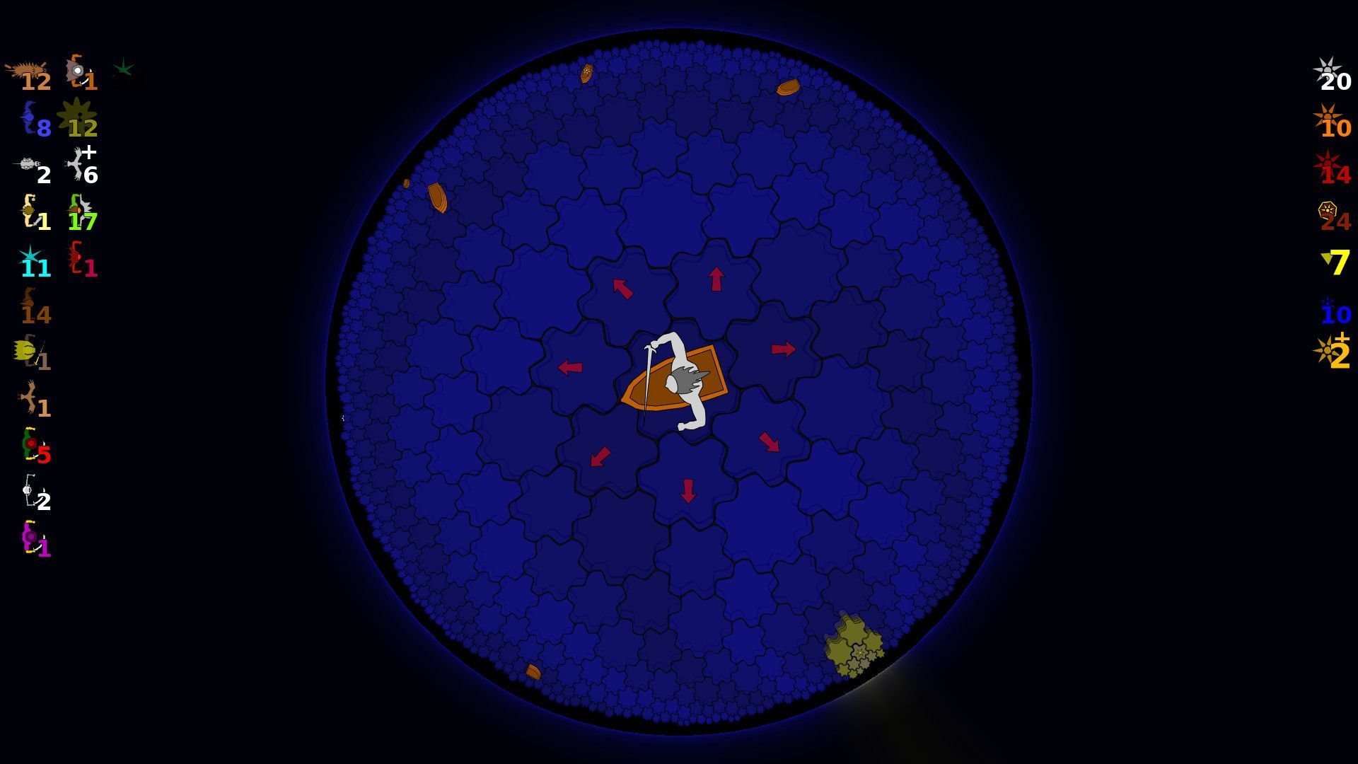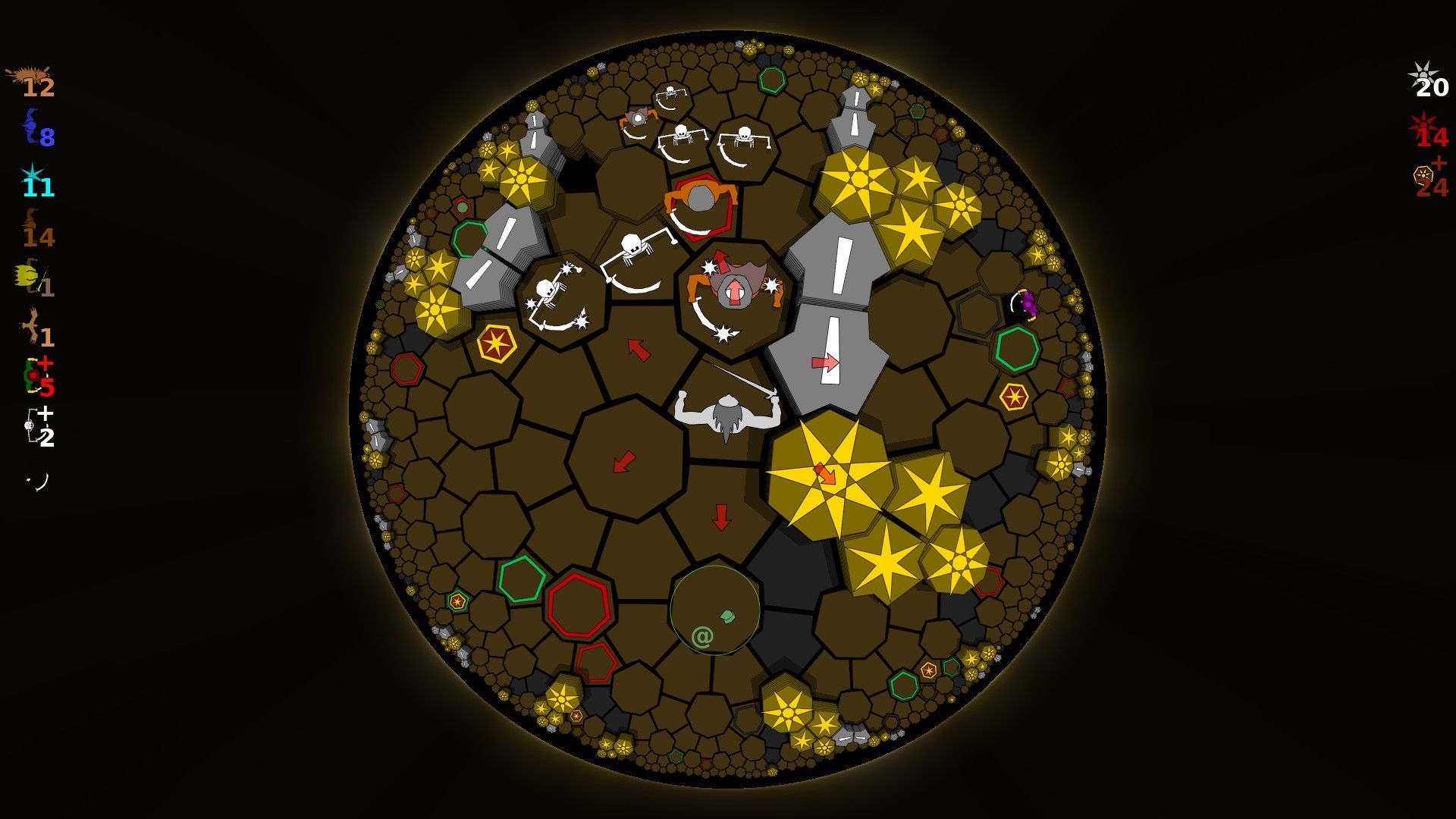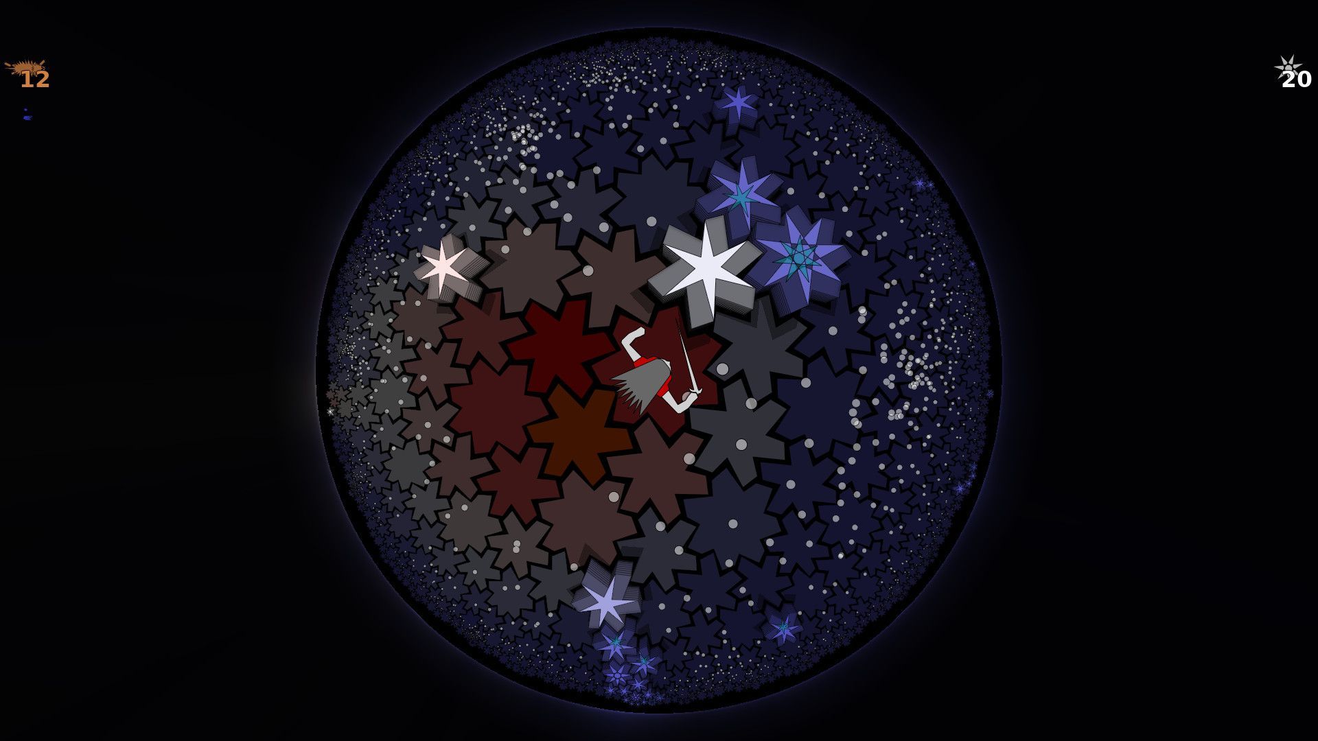 The twist is the unique, unusual geometry of the world: it is one of just few games which takes place on the hyperbolic plane. Witness a grid composed of hexagons and heptagons, straight lines which seem to be parallel, but then they diverge and never cross, triangles whose angles add up to less than 180 degrees, how extremely unlikely is it to reach the same place twice due to practically infinite size of the world (centillions of locations in just 700 steps from the starting point), and how the world seems to be rotated when you do return. All this matters for the gameplay. The game is inspired by the roguelike genre (focusing on puzzle-roguelike positioning tactics rather than RPG elements), works of M. C. Escher, and by puzzle games such as Deadly Rooms of Death.