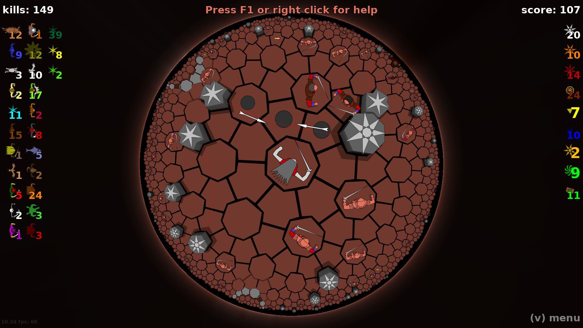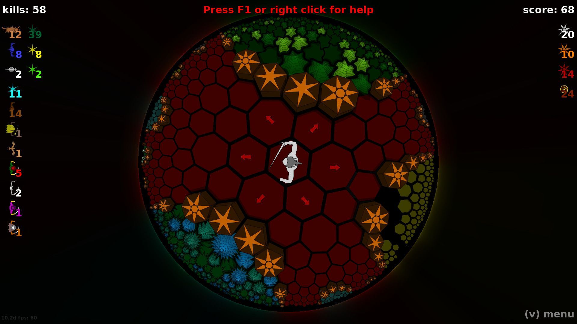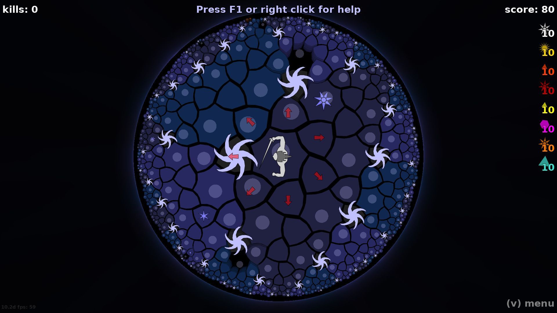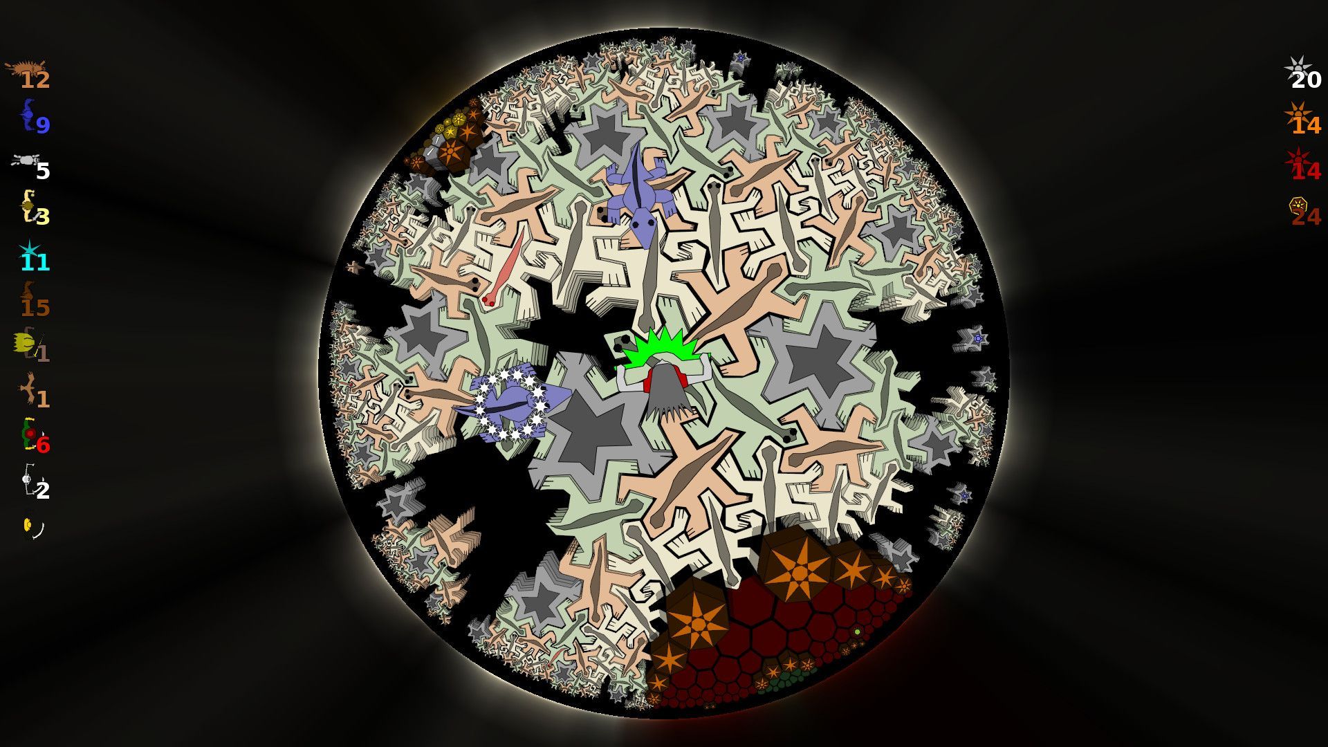 The twist is the unique, unusual geometry of the world: it is one of just few games which takes place on the hyperbolic plane. Witness a grid composed of hexagons and heptagons, straight lines which seem to be parallel, but then they diverge and never cross, triangles whose angles add up to less than 180 degrees, how extremely unlikely is it to reach the same place twice due to practically infinite size of the world (centillions of locations in just 700 steps from the starting point), and how the world seems to be rotated when you do return. All this matters for the gameplay. The game is inspired by the roguelike genre (focusing on puzzle-roguelike positioning tactics rather than RPG elements), works of M. C. Escher, and by puzzle games such as Deadly Rooms of Death.