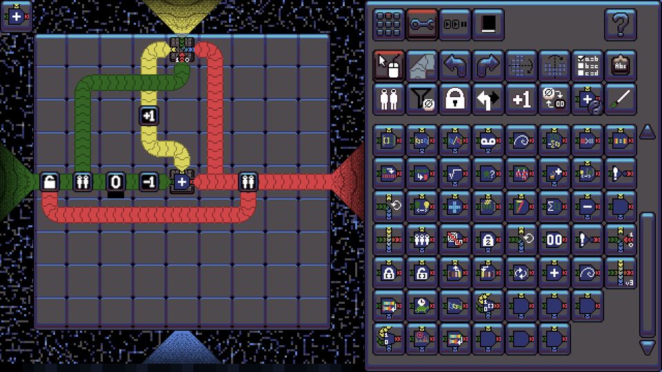 There are only a handful of base components to master. Clone replicates a token. Filter redirects a zero or Nul token to another path. A lock will not allow a token through until it has been unlocked from the side. Switch directs tokens left or right, which can be selected by supplying a token at the other end. Increment and decrement units add or subtract one from the token. And finally a nullifier converts a zero to a Nul and vice-versa. All other units in the game are ones made by you.