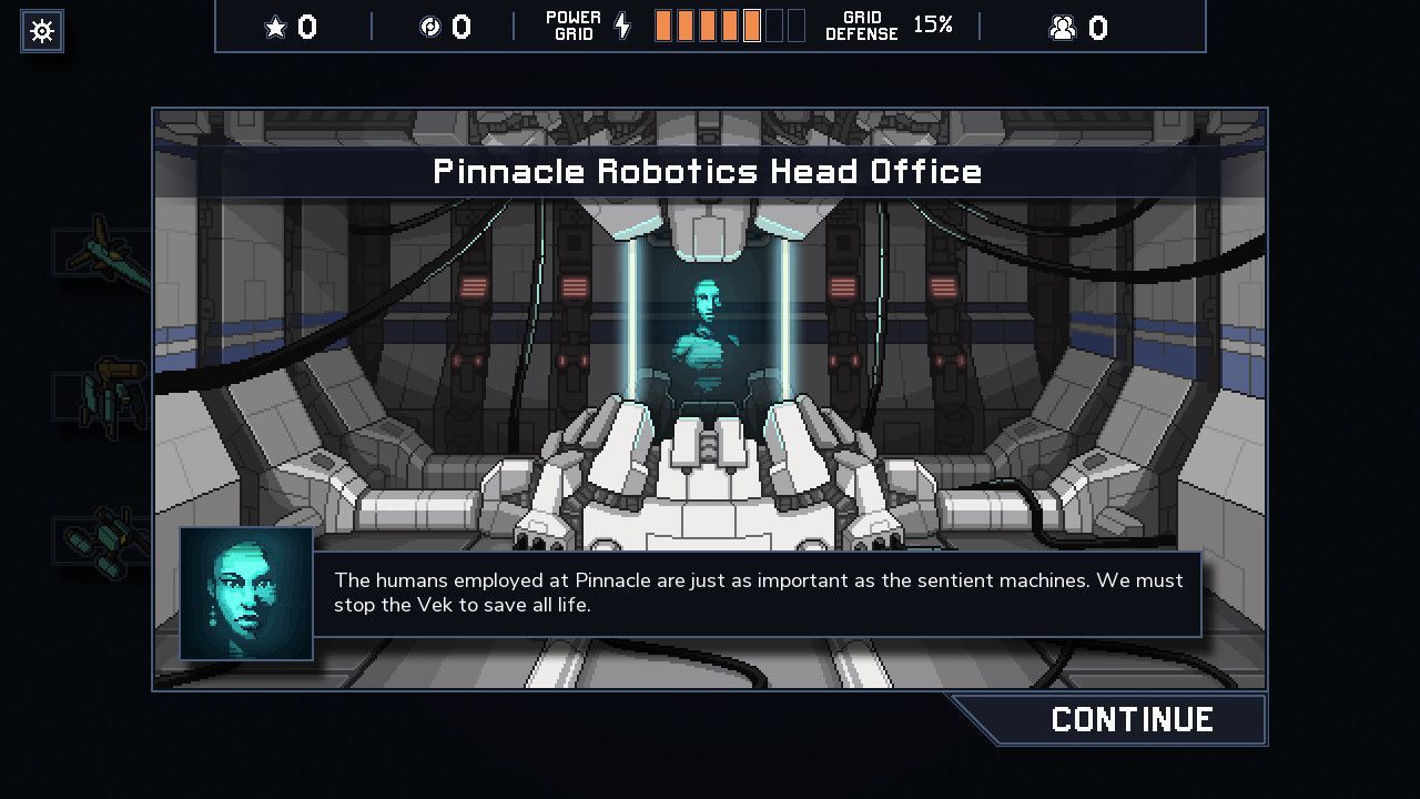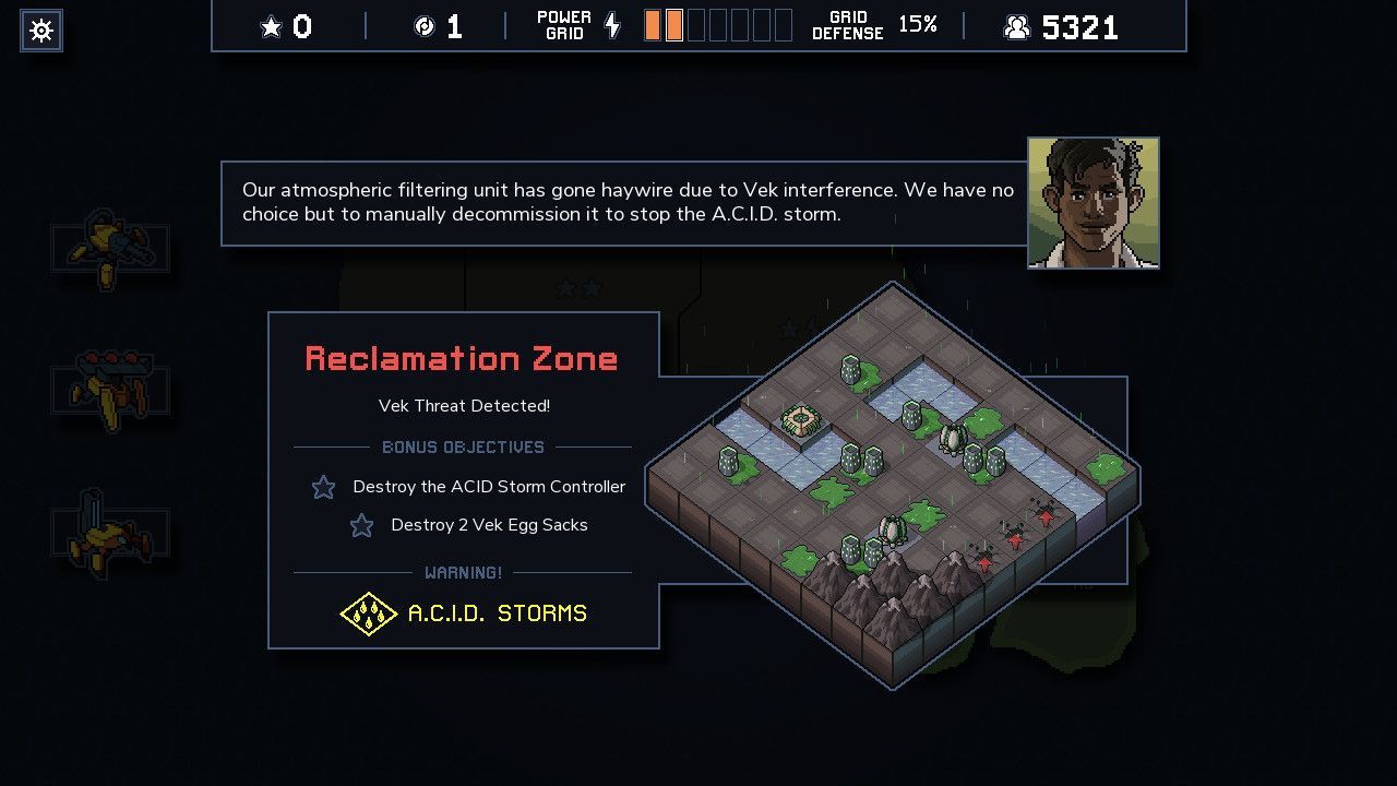 Each encounter pits your three mechs against a horde of Vek on an 8x8 grid populated with vulnerable city tiles, which provide power to your units. The goal of each encounter is to protect these cities from enemy attacks until a specified number of turns have passed. If a city is hit, you will lose a bar on the “Power Grid” meter that serves as a running tracker of city health and carries over to future encounters. Should that tracker ever reach zero, the campaign ends and humanity is doomed, so it is crucial to mitigate damage.