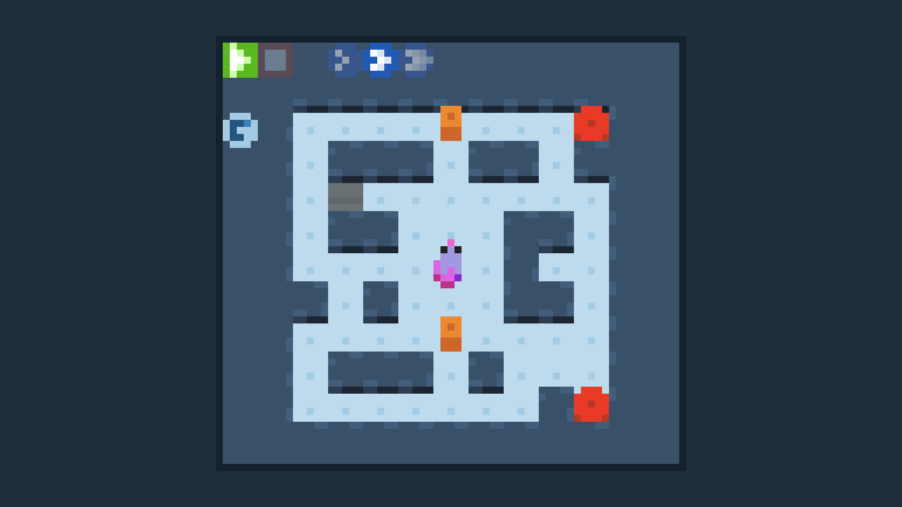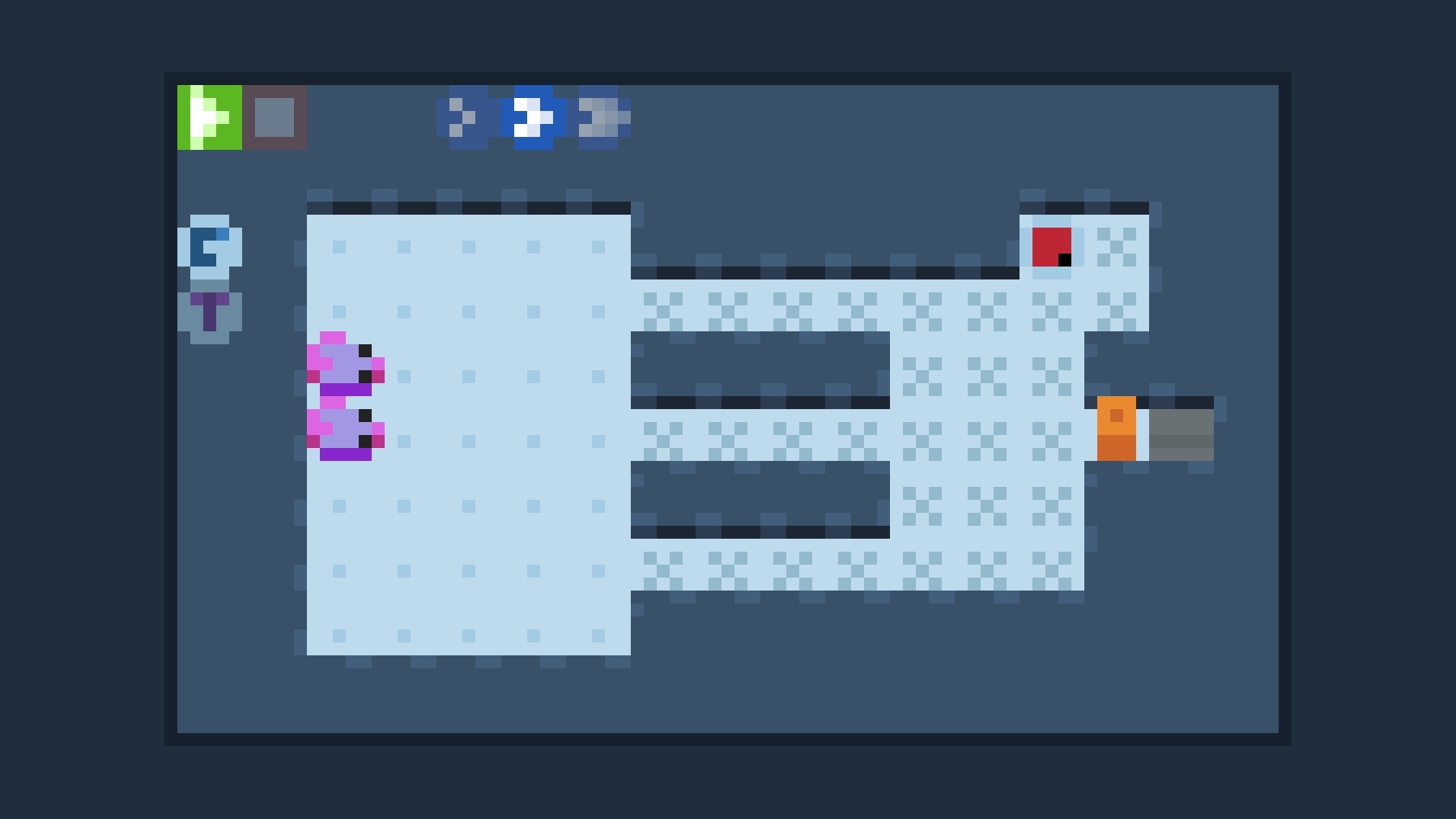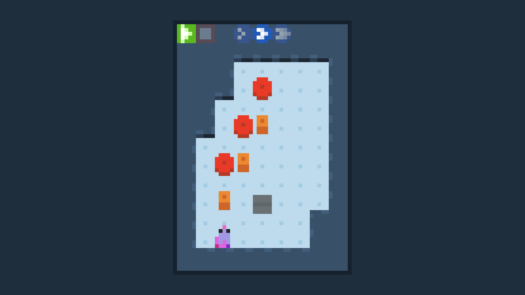 Lab Rat-ional Thinking is a grid-based setup-and-play game about directing mice to their holes. Using the in-game cursor, you'll place tokens on the grid that will instruct the mice to rotate, turn back on themselves, and other instructions revealed throughout the game. After placing everything, press the play button to set everything in motion and watch as the mice (hopefully) make their way to their destination.