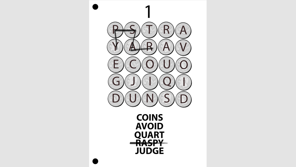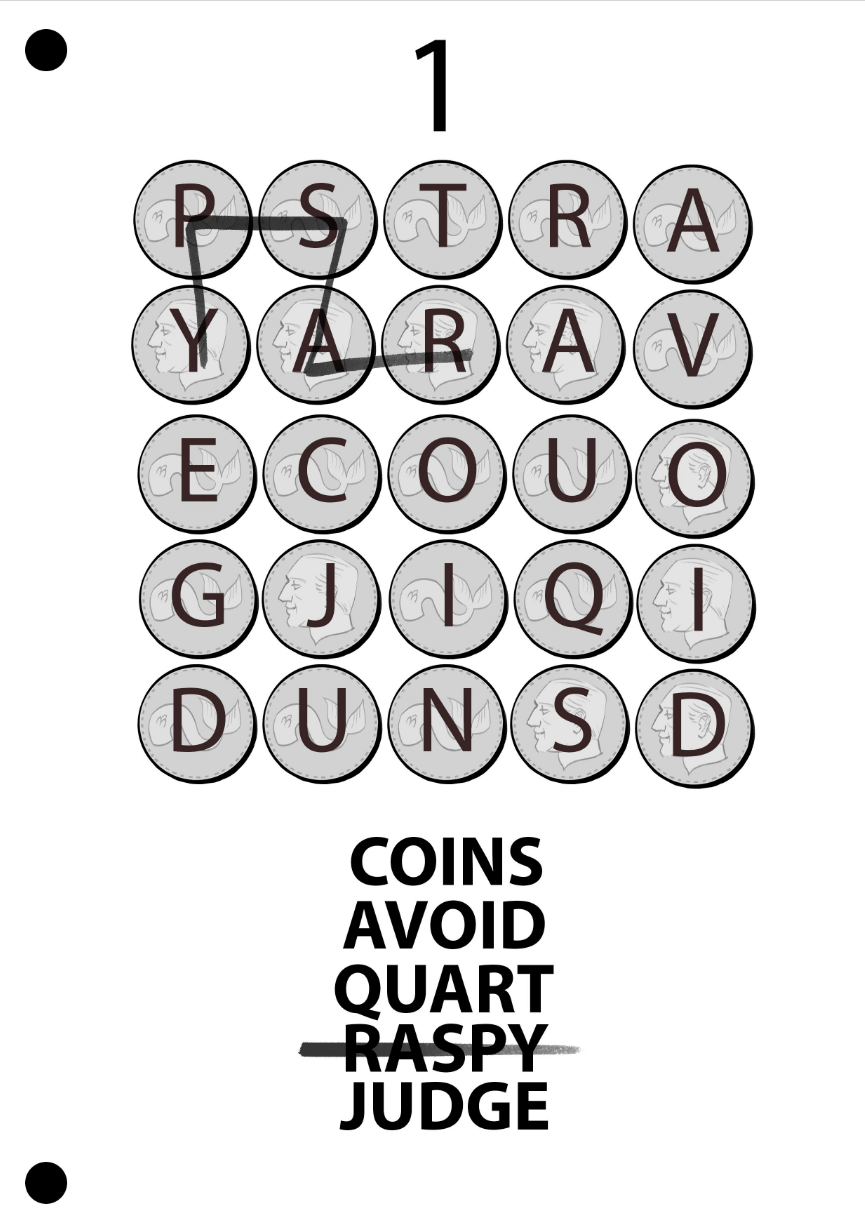 Letter Coins is a small print & play puzzle, where you find words among the coins. It gets progressively harder as you play through, before asking you to solve a larger and harder puzzle to complete it.