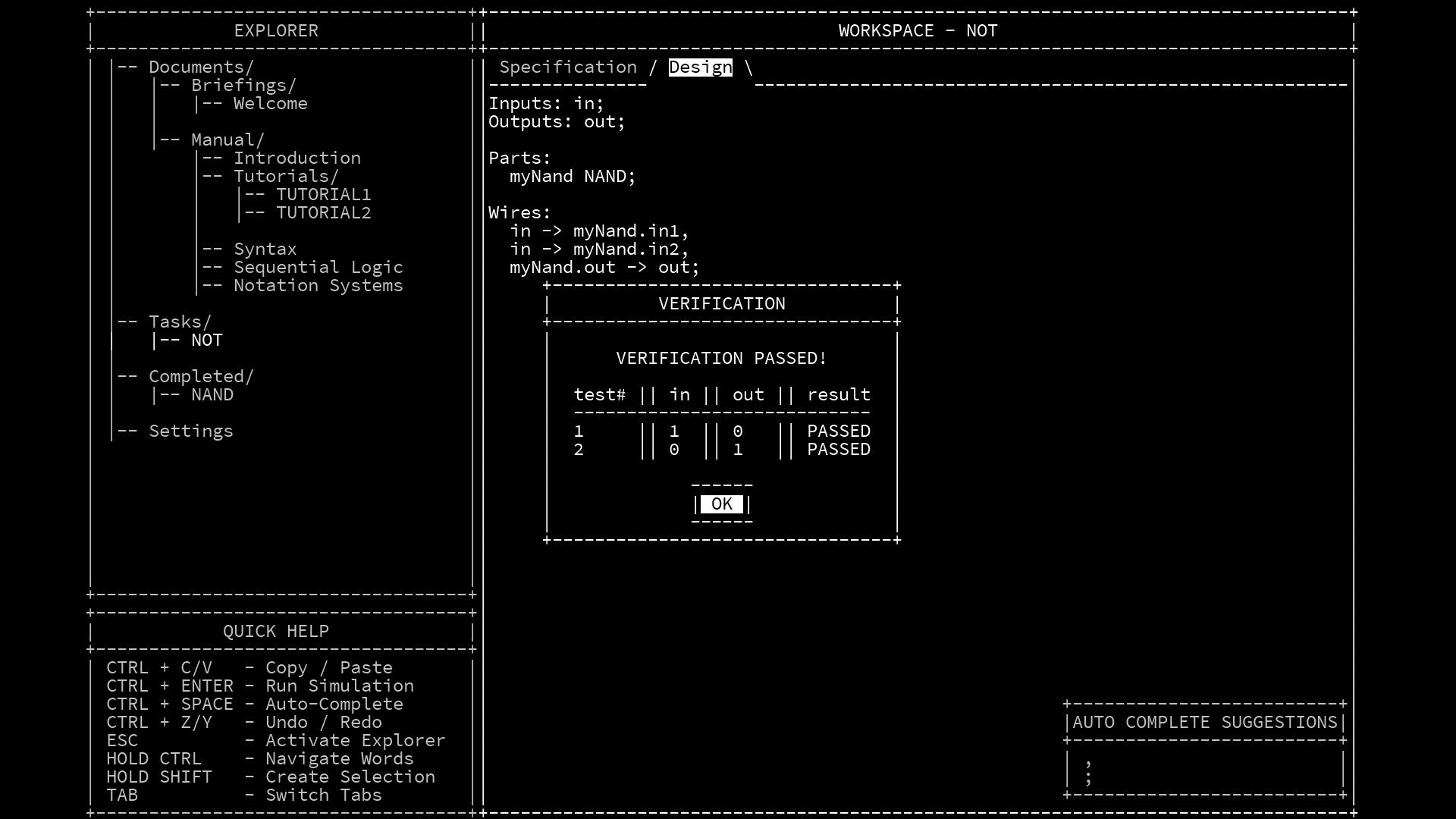 - Create hardware designs based on more than 20 specifications (e.g. multiplexer, adder, ALU, RAM, etc.)