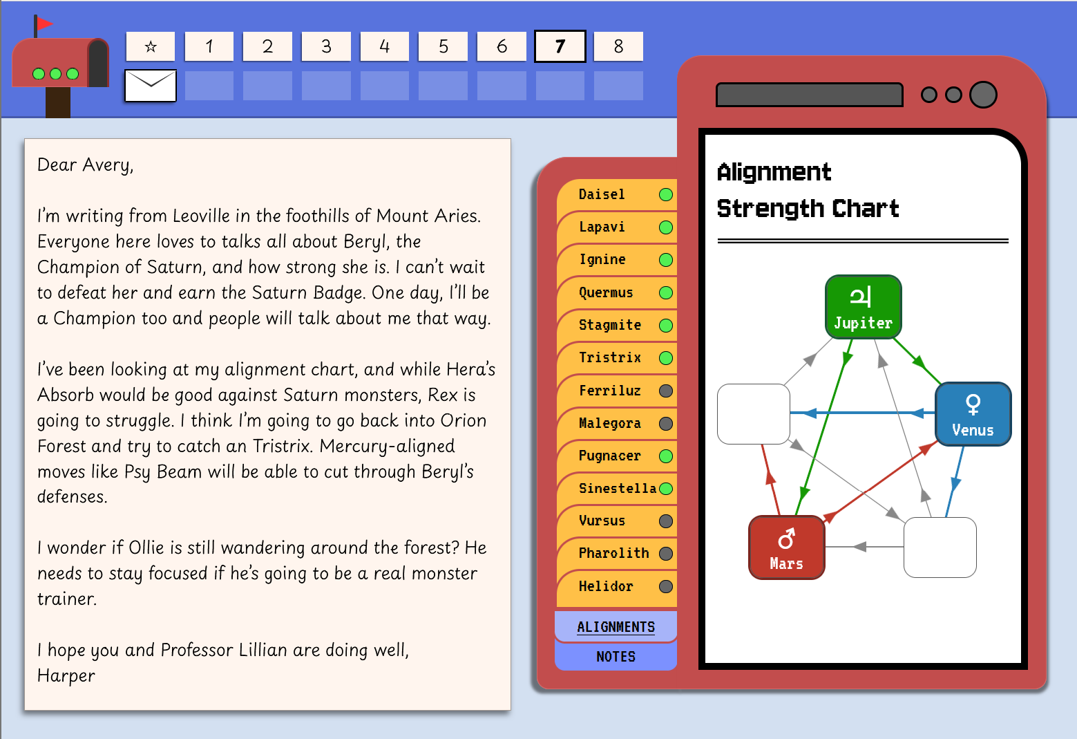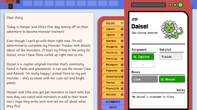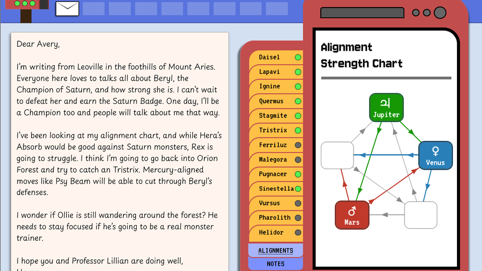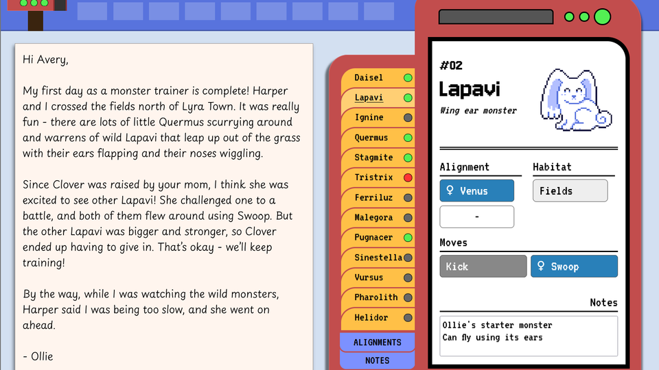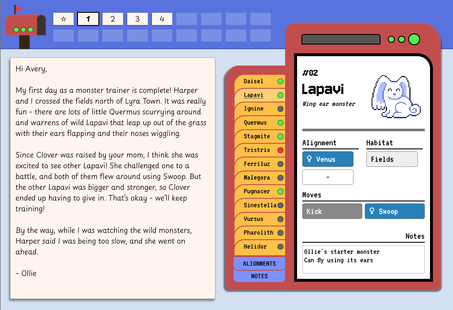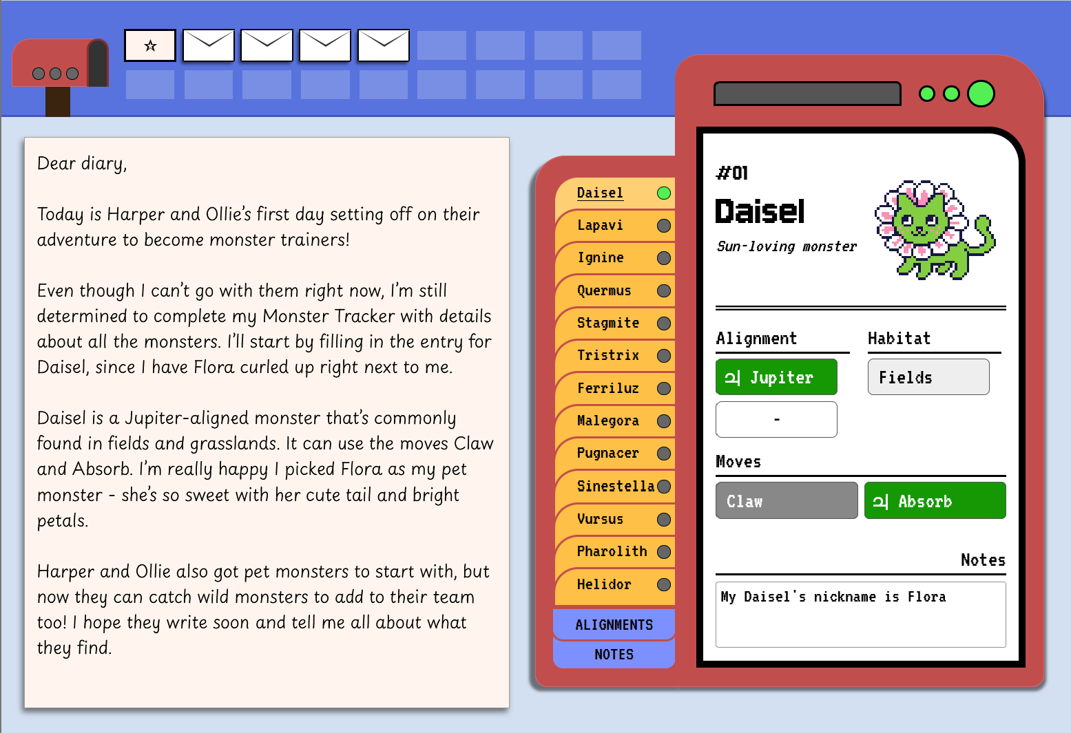 My Friends the Monster Trainers is a detective game inspired by both Pokémon and deduction puzzles. You have to fill in the details in a creature database using handwritten letters from your friends who are out in the field catching and battling them. The game features charming monster design along with fun puzzling adaptations of the genre, like using a creature-type weakness chart to guide identification.