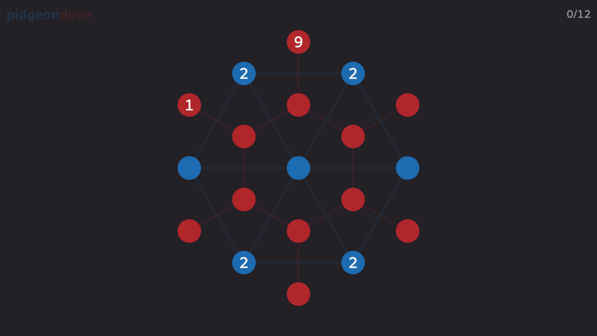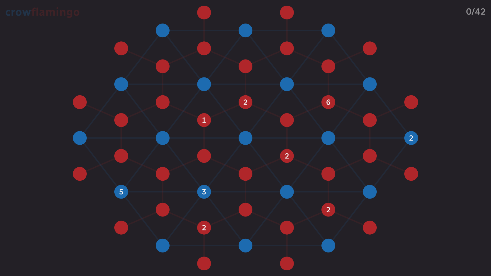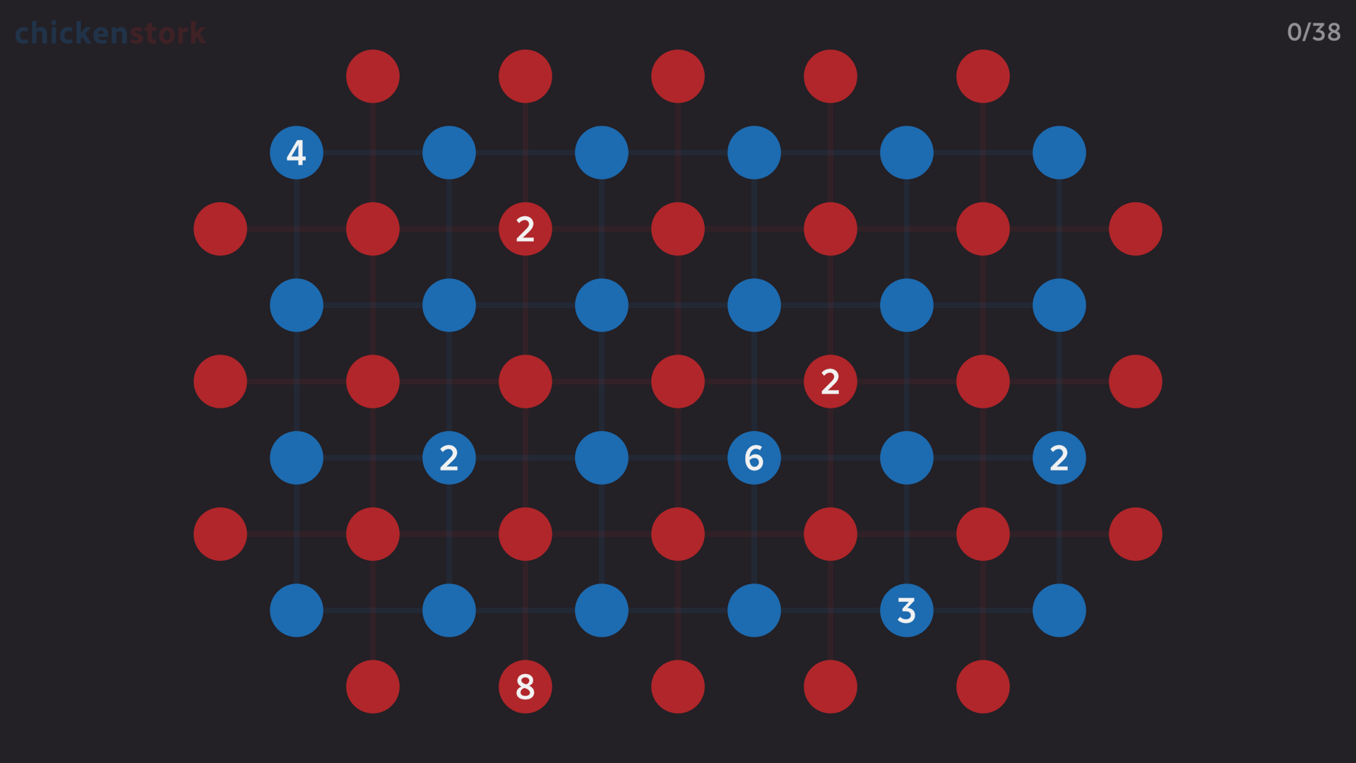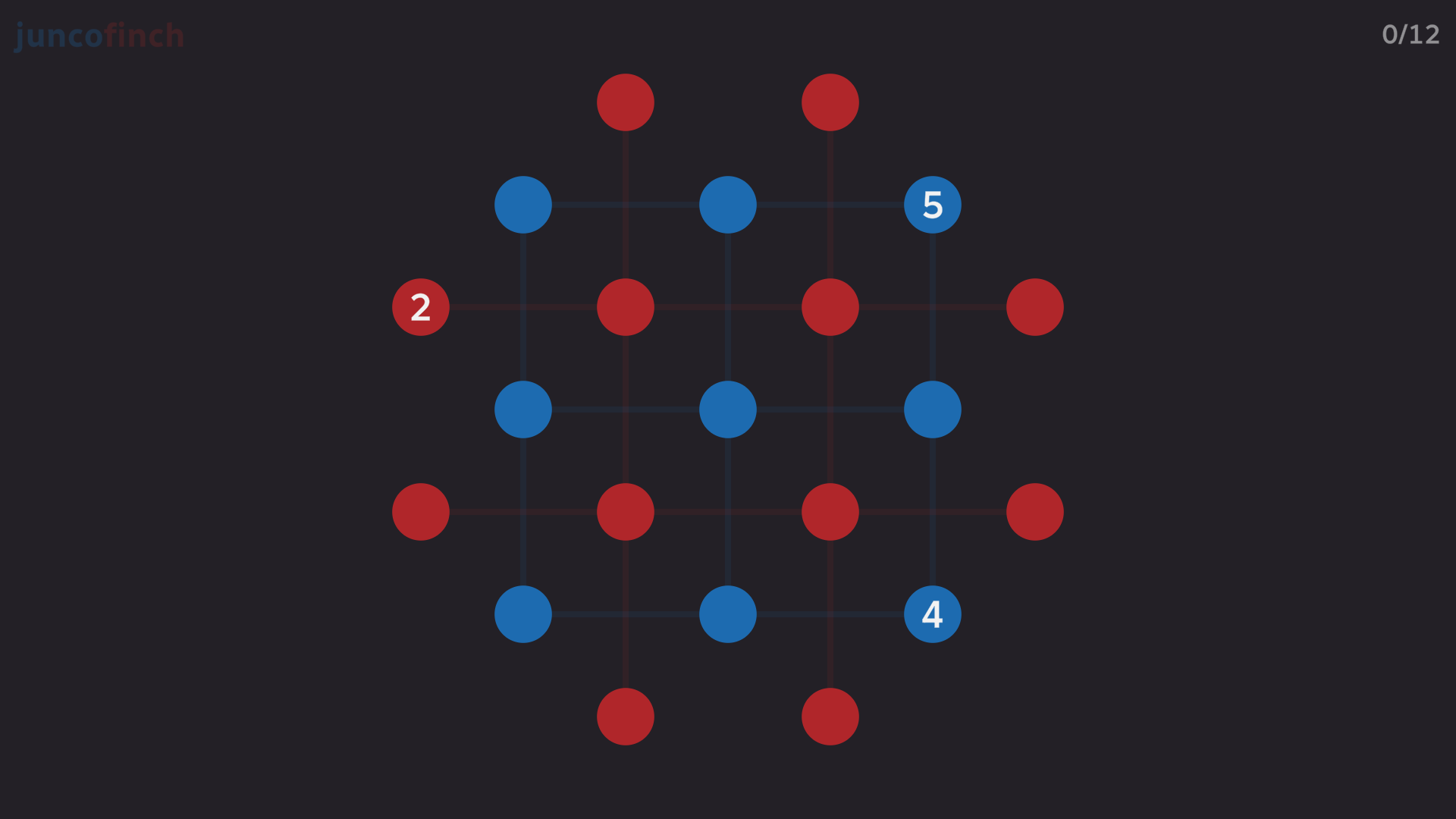 The nodes and the edges in a level are either blue or red. You can activate edges, connecting several nodes together in a new group. Some nodes have numbers on them, denoting the size of the group they should be a part of by the end of the level. Additionally, the edges come in intersecting pairs, and either the blue edge or the red edge in each pair should be activated. So, you’ll need to figure out how to activate a single edge at each intersection in a way that fulfills all numbered nodes.