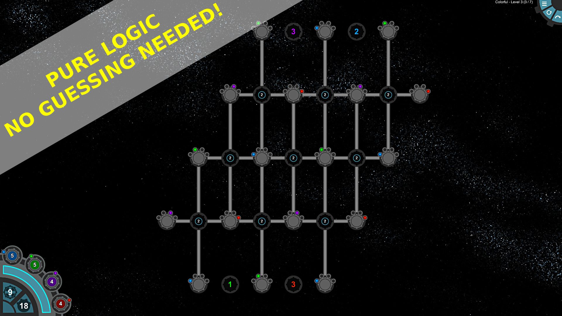 In Patterna, each level is a network of nodes (also known as a graph). In a way similar to HexCells or Minesweeper, each node is ultimately in one of two states (known as pattern and non-pattern). Initially, most nodes' states are unknown. It is the player's task to correctly classify these unrevealed nodes using information based on distance, connectivity, and color. Correctly classifying a node may reveal more information that in turn helps you to solve the level.