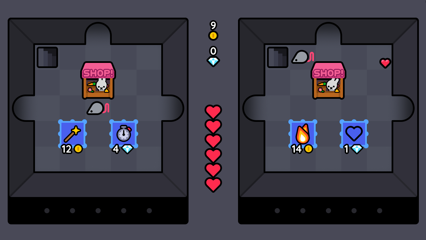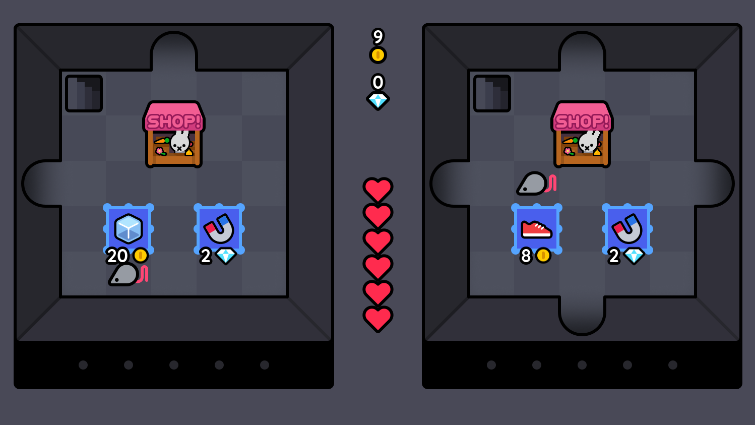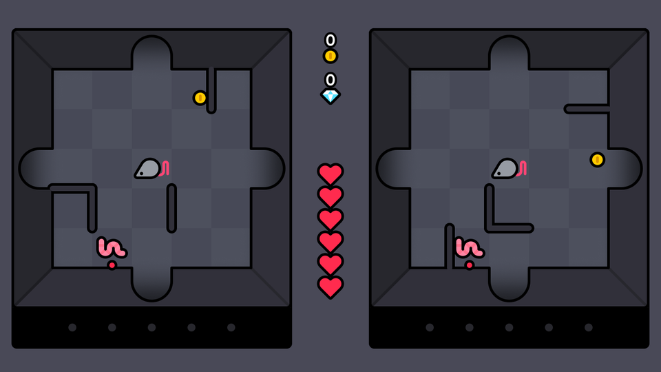 Search for treasures in pocket-sized rooms as two entangled rats.