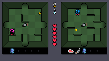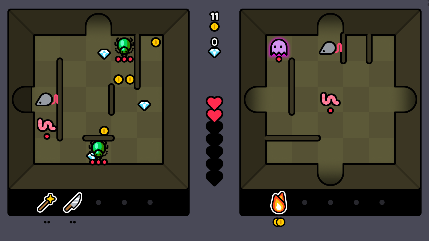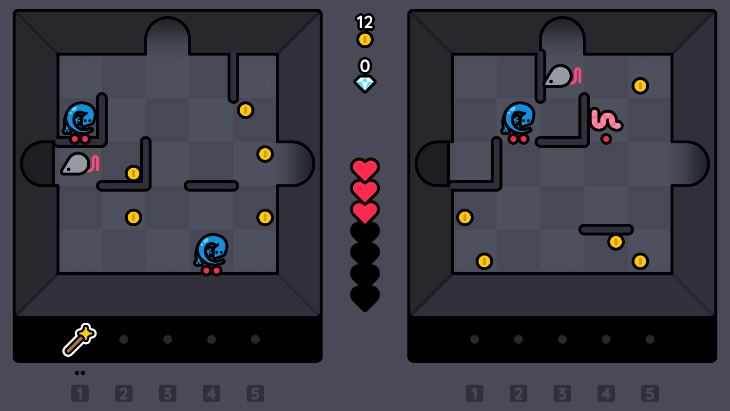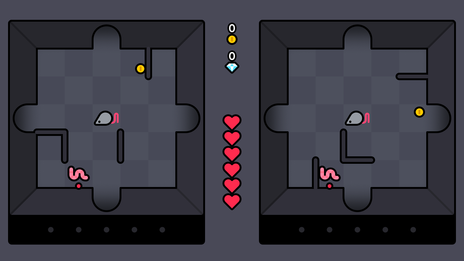Search for treasures in pocket-sized rooms as two entangled rats.