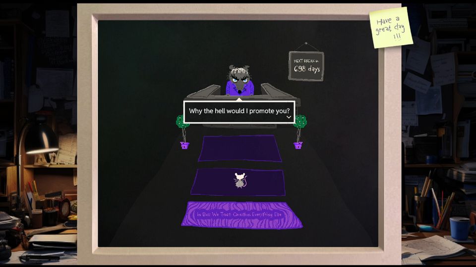 In a series of single-room puzzles, both your intellect and your morality will be tested by the "AI". You will take advantage of your coworkers, manipulate and sacrifice them for your own gain, take credit for their work and lose all your remaining dignity to get to job you want. Coffee will naturally play an important role in this game within a game as well as gossips, emails, deadlines, backstabbing and more. Who knows? Maybe you will even attend one of those endless meetings or climb the corporate ladder by sucking up to your boss. Just like in any corporation, you’ll have to endure a lot.