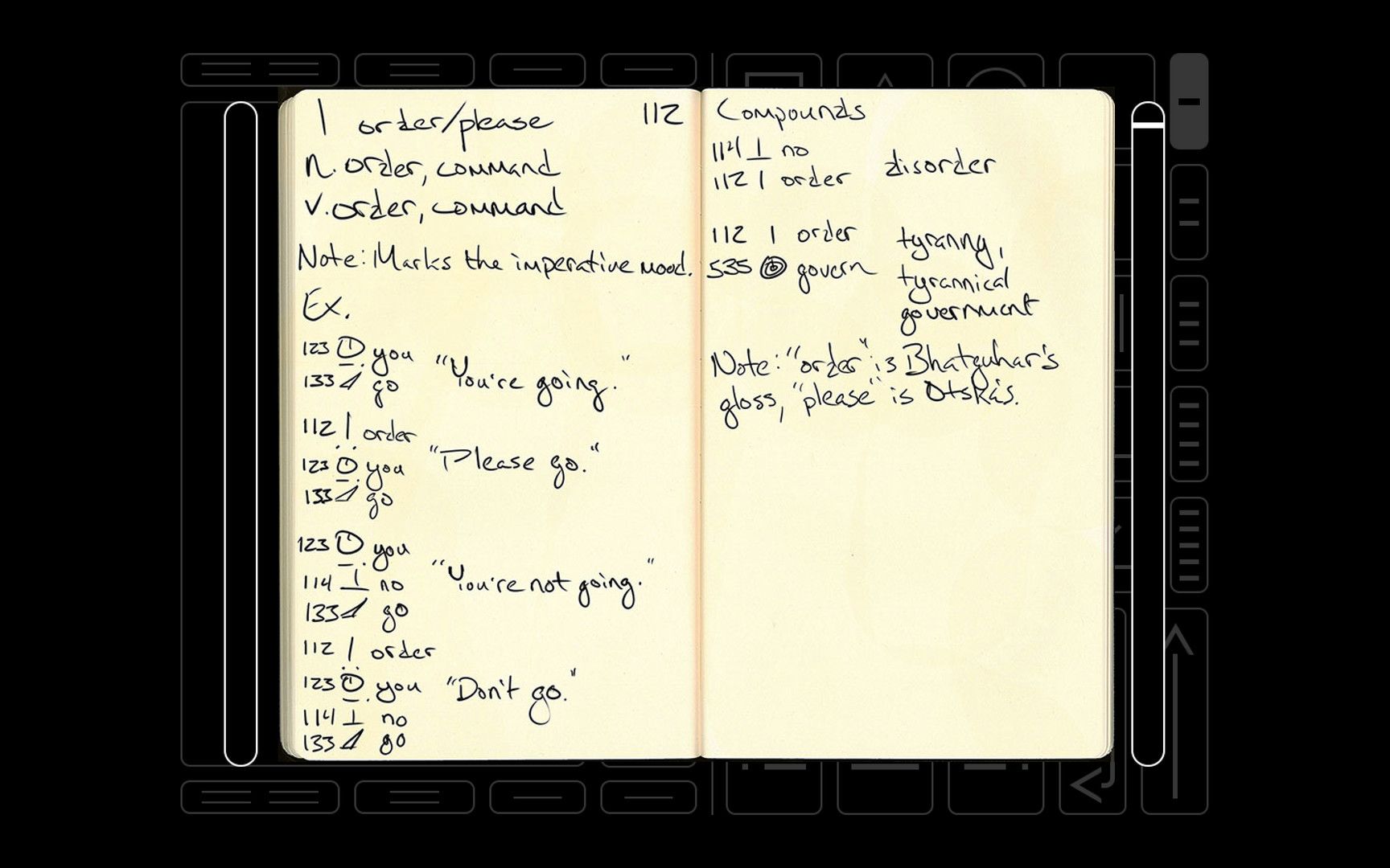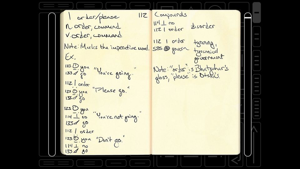 Assisting you in your investigation are your handwritten journal and dictionary, easing you into the game's bizarre language, providing you with a reliable reference, and introducing you to the literature and lore of the world.