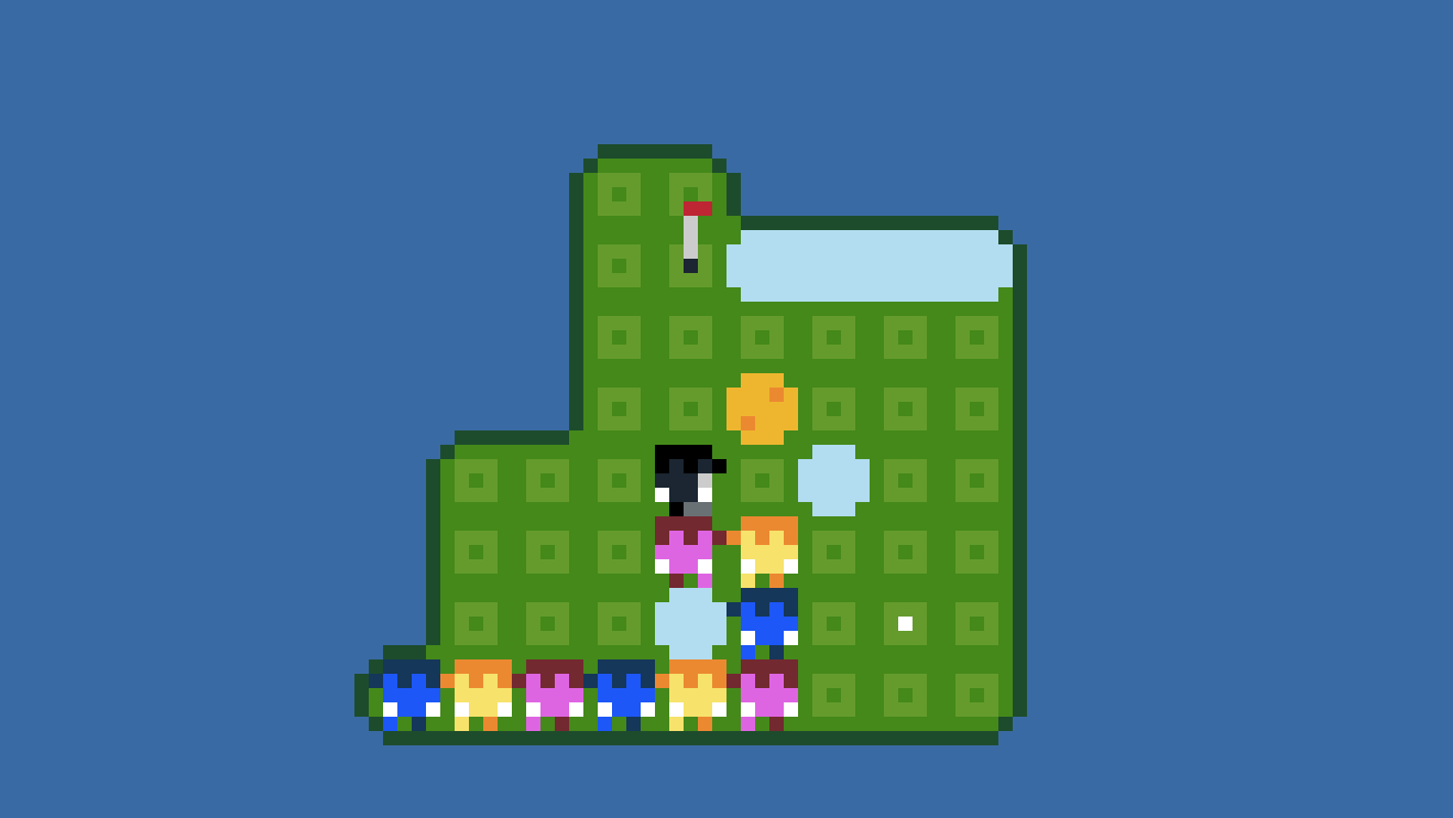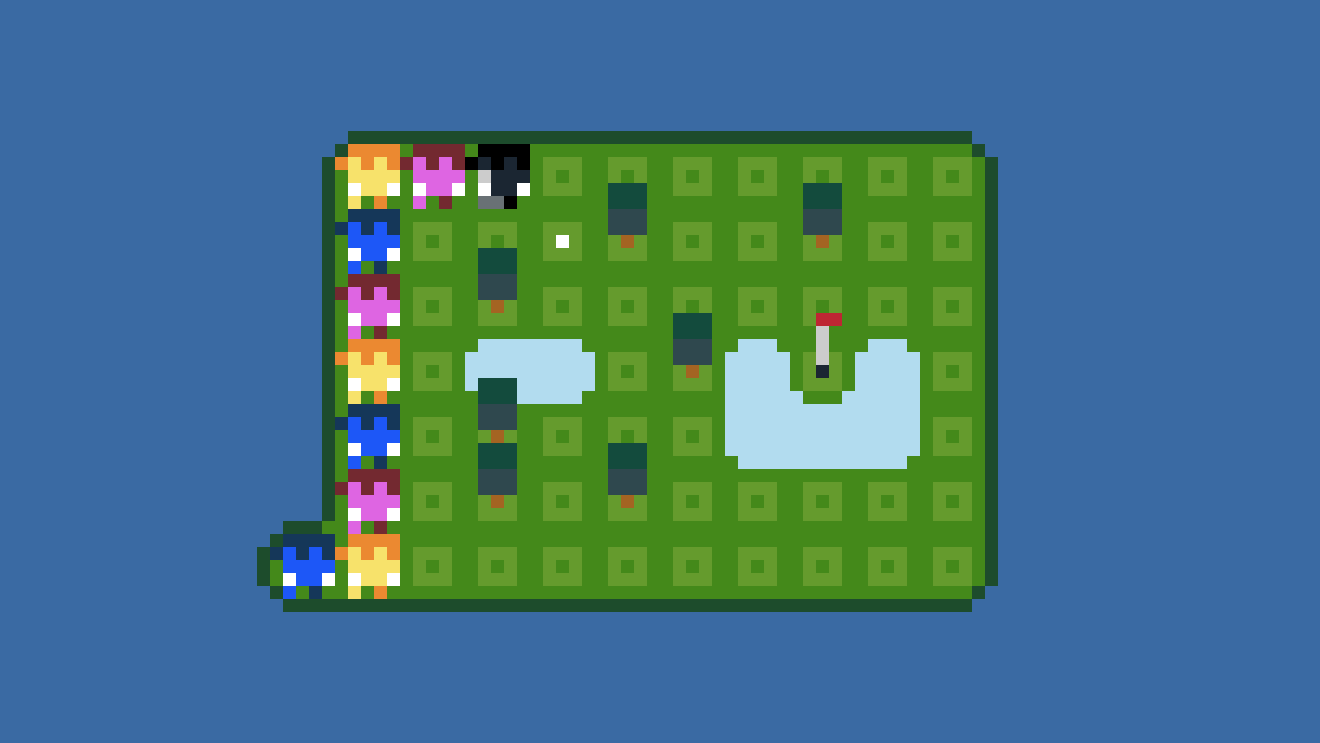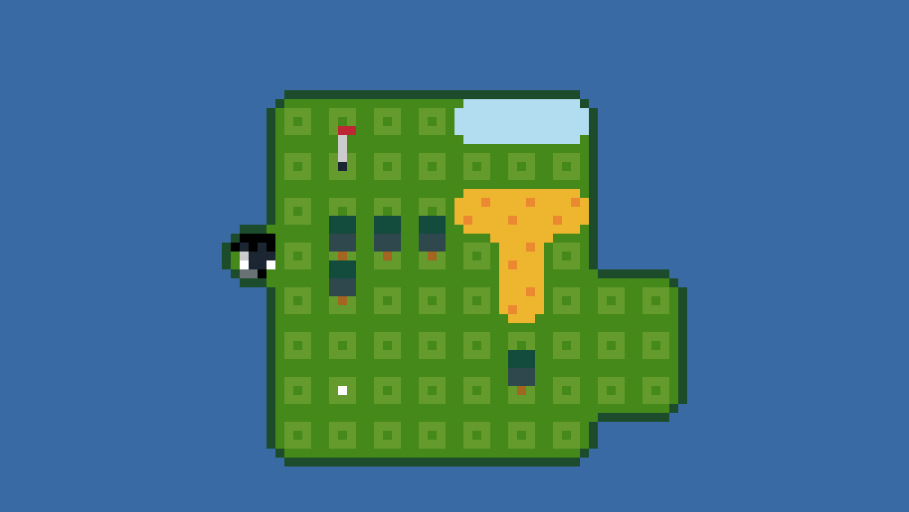 Inspired by real-life golf terrains, the game features a few obstacles which further complicate the course. Some levels contain trees which block the ball and the path of the golfers, or water in which the ball could sink. The last holes even have sand-filled bunkers with a particular effect on the club. Though the puzzles can be difficult, any action can be undone (a classic feature of PuzzleScript games), making the experience rather forgiving.