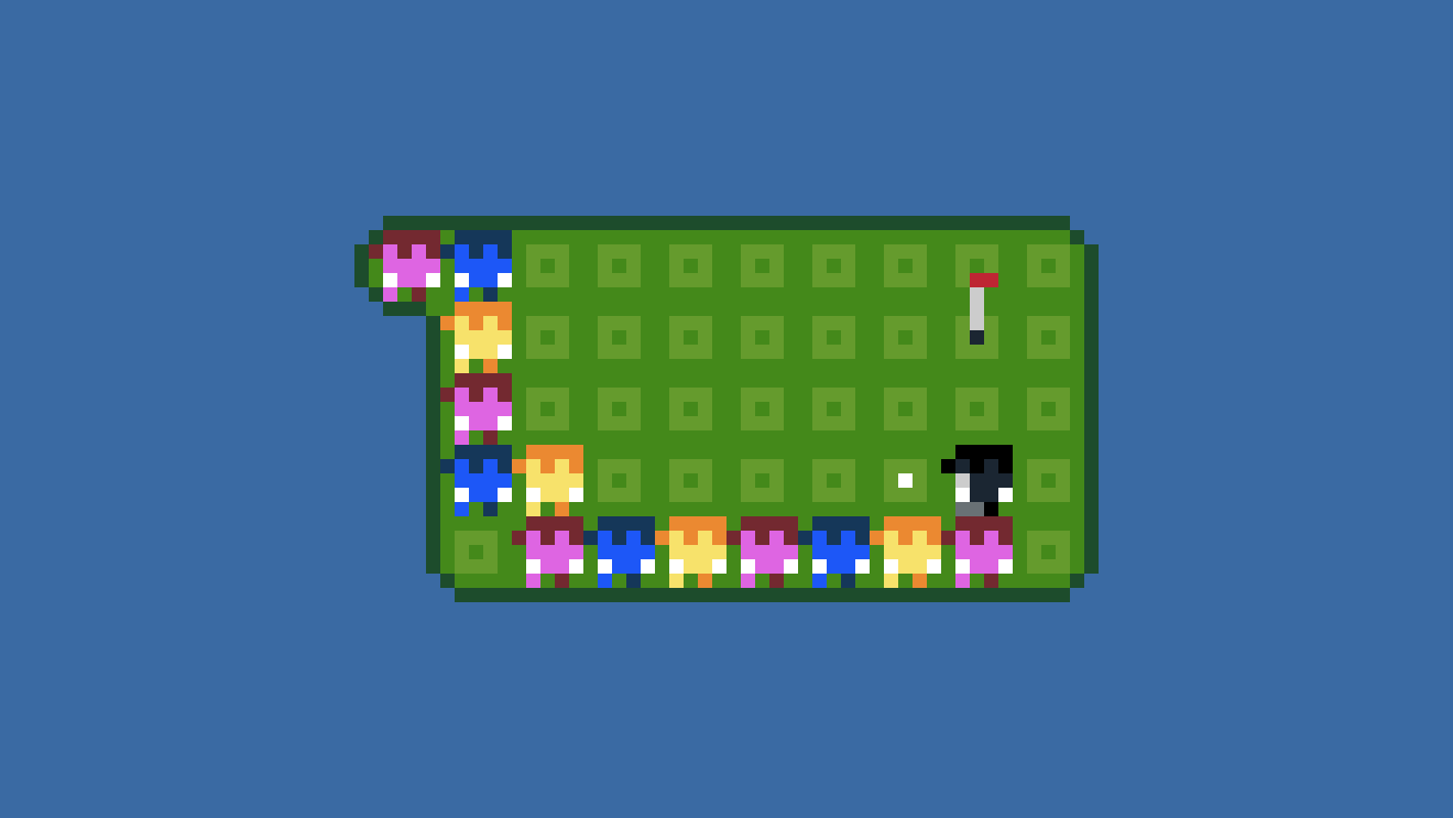Shall We Golf? (also known as みんなでGOLF!) is a snaking puzzle game about team-golfing with a bunch of friends. The golfers walk onto the course as one uninterrupted line; any golfer can hit the ball, and the line also acts as a wall blocking the ball’s trajectory. Golf games often involve timing and precise movements, but Shall We Golf? removes these elements in favor of spatial visualization and logical thinking.