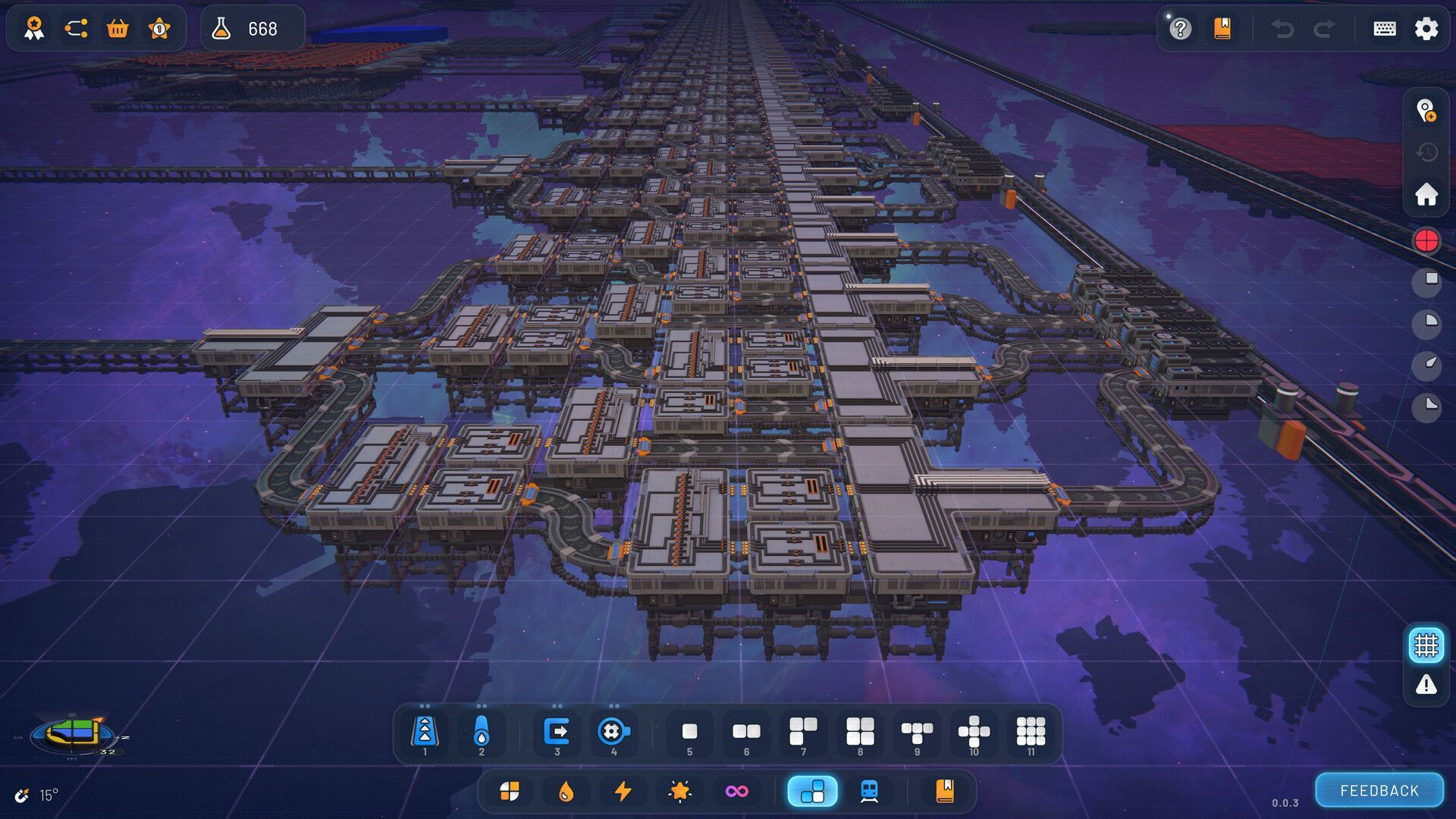Start your operation from a single asteroid and continuously expand by building new platforms. Unlock new layouts as you progress, and grow from a single belt into a massive multi-station space factory connected by space trains. Design modular blueprintable platforms to build on a massive scale, placing hundreds of buildings with just one click.