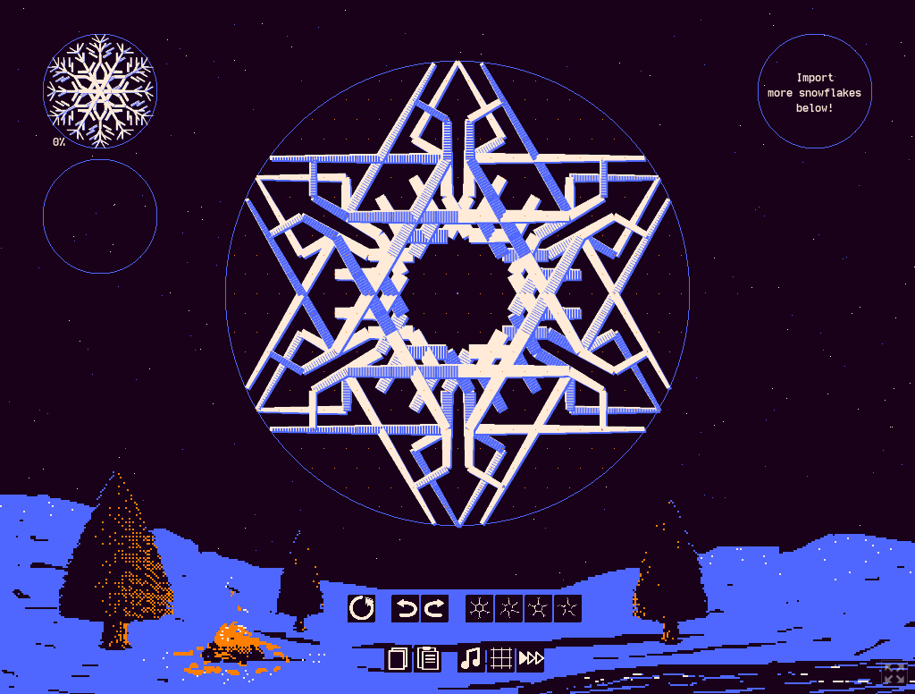 Shareflakes is a single-screen line-drawing puzzle game, published for day 15 of the Confounding Calendar 2025.
