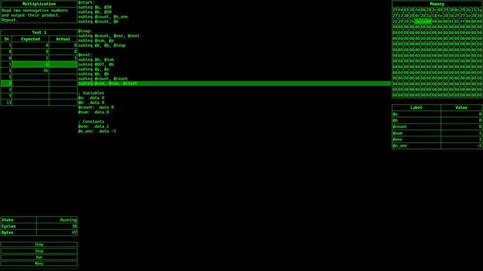 It's an assembly language zachlike for everyone! New programmers will appreciate how few unique instructions there are to learn (just one!), and experienced programmers will appreciate how poorly suited this one instruction is for writing straight-forward programs.