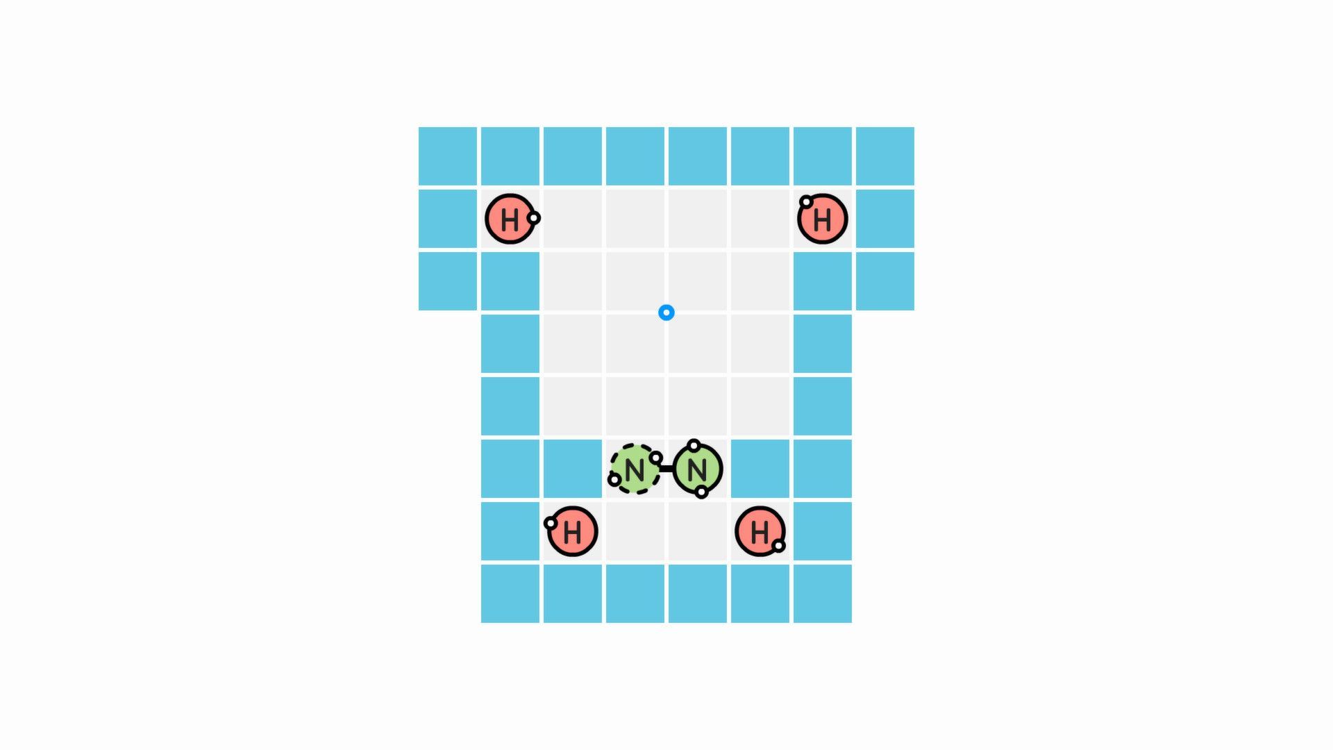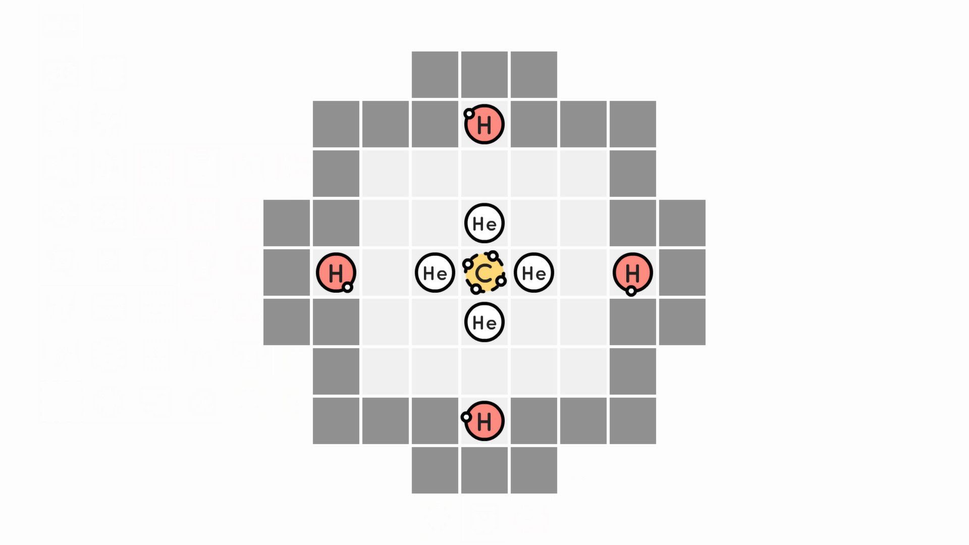 In each puzzle, you control an atom that can move around the grid and push other atoms. Each atom, including the one you control, may have a number of available electrons rotating around it. allowing it to form chemical bonds. Typically, when two atoms both have an available electron and they’re brought next to each other, then a bond will form between them, and from here on pushing one of the atoms will move both as a single, solid molecule. The goal of each puzzle is to move atoms and molecules until every electron is used in a chemical bond.