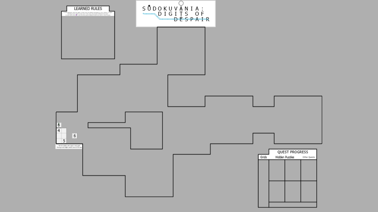 This is a labor of love combining sudoku with my favorite video game genre - Metroidvanias. MVs are known for featuring exploration, gaining new abilities, and difficult boss fights, and I noticed the similarity to grid-based puzzles as soon as I started setting them. So, I present Sudokuvania: Digits of Despair.