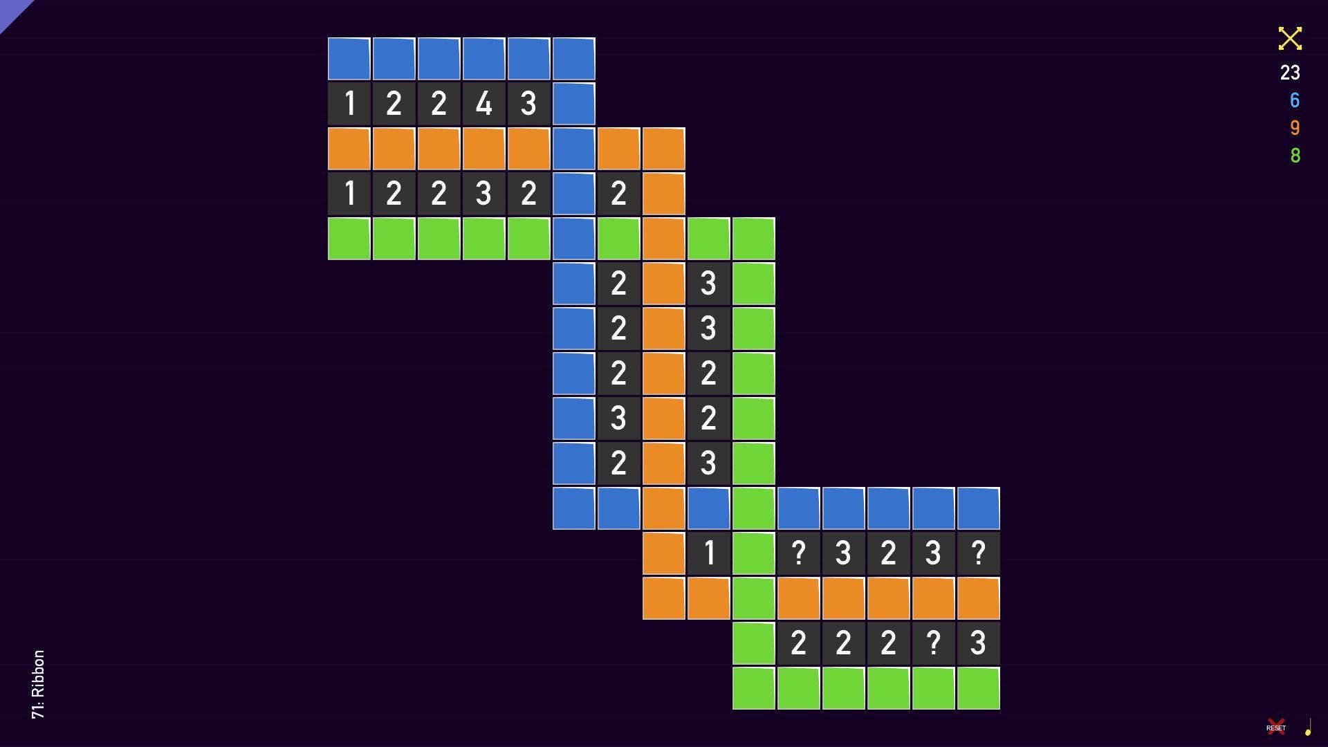Tametsi’s gameplay will be familiar to anyone who has played Minesweeper. Each level is a grid of clickable tiles, some of which conceal mines. When you click on a tile, it is either revealed as a mine, or it indicates the number of adjacent mines (if any). You can also right-click a tile to flag it as a mine — but the game won’t validate your guess until you’ve gone over the whole grid. Your goal is to flag all the mines without left-clicking on any. In-game drawing tools are provided to help you track your logical hypotheses.