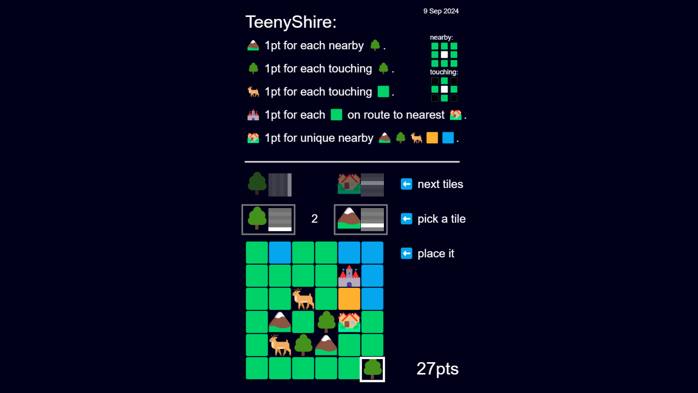 Overall, it’s a short and fun browser-based game that relies on your device’s emojis to capture the feeling of building the teeniest of shires. The turns are set daily, and they’re the same for everyone playing the game. You have three attempts to improve your score, and you can easily copy and share your results with other players to show off your optimal town.